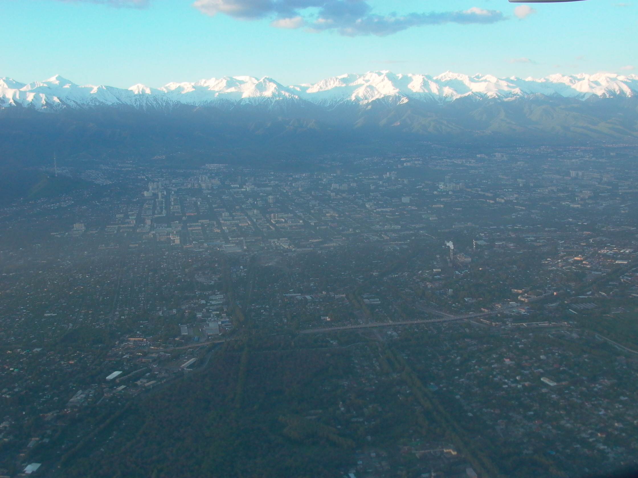 In Almaty we lived at the feet of the steep and wild Tien Shan mountains. This is Almaty seen from an airplane:
