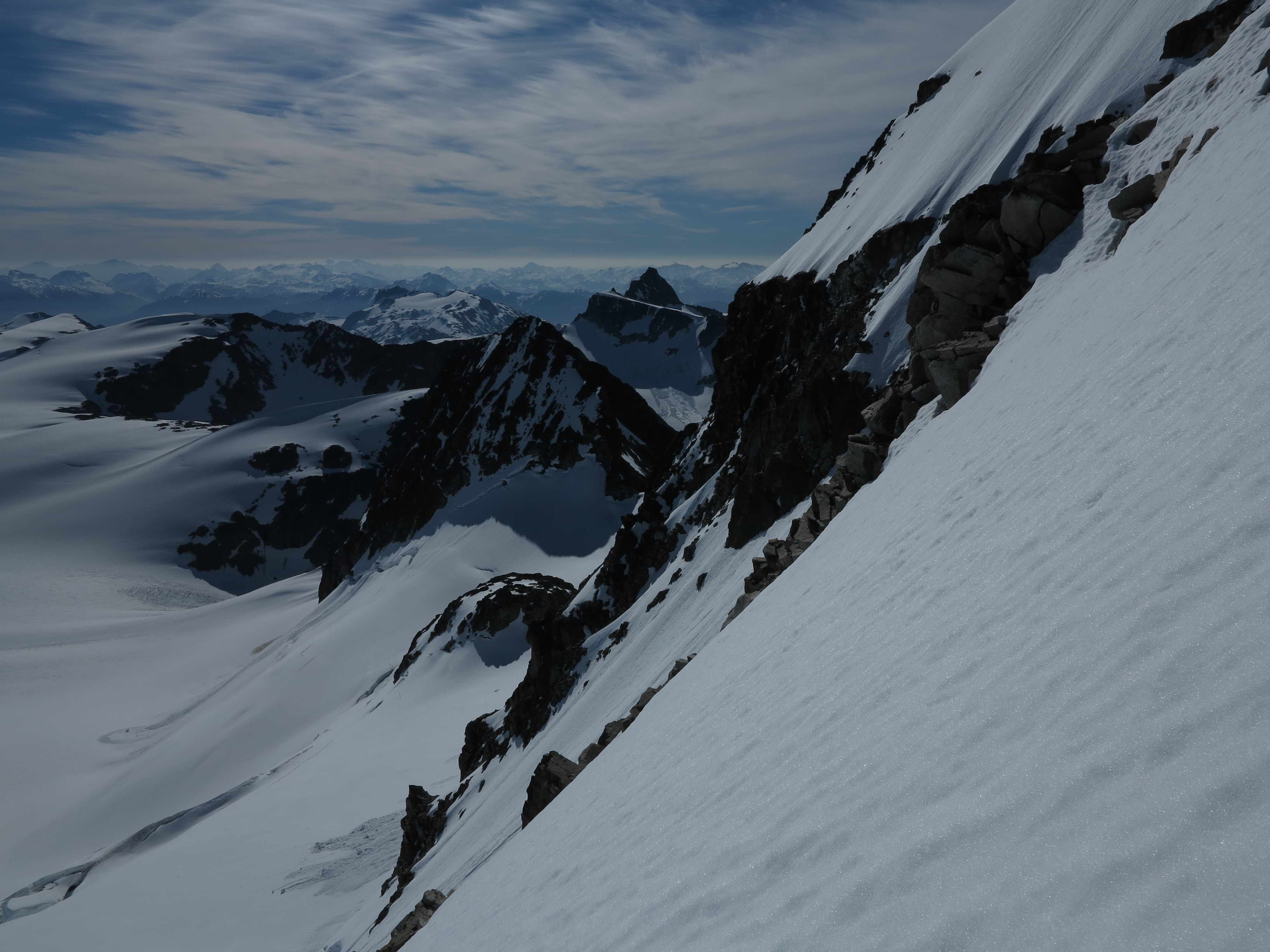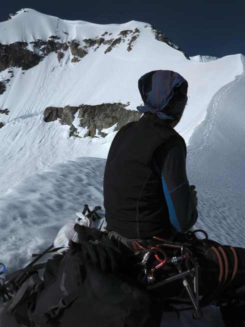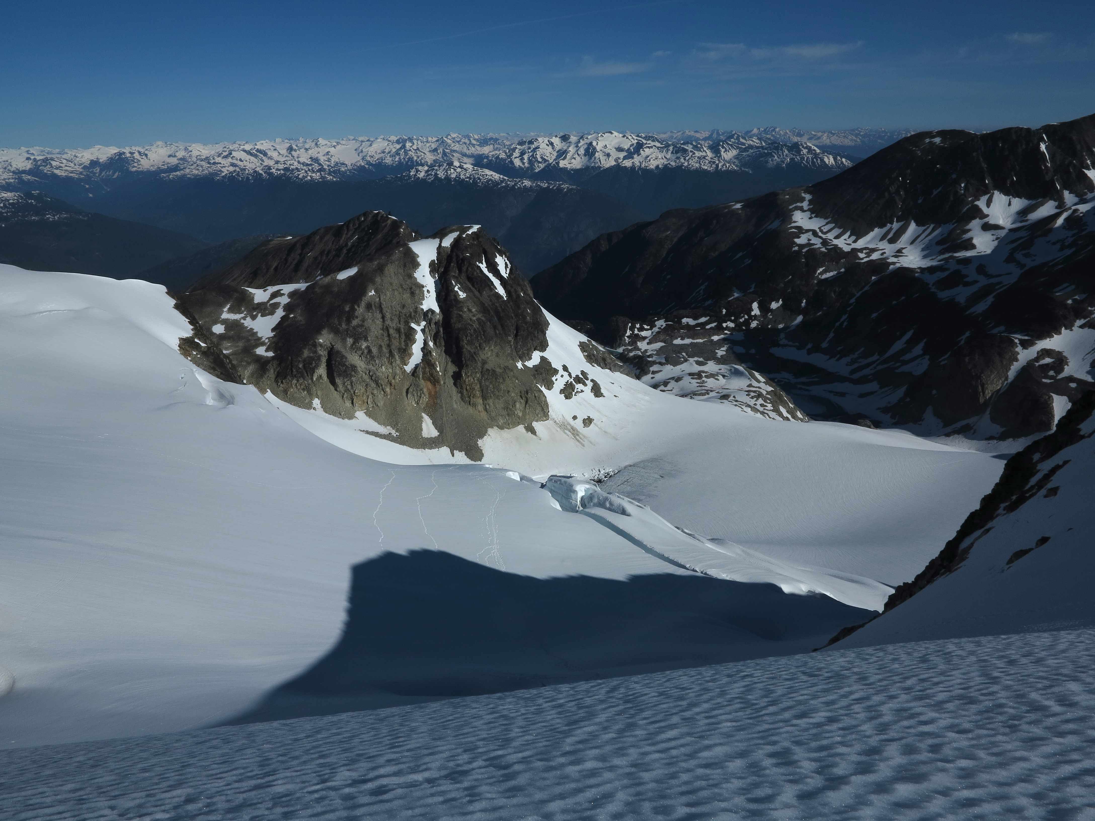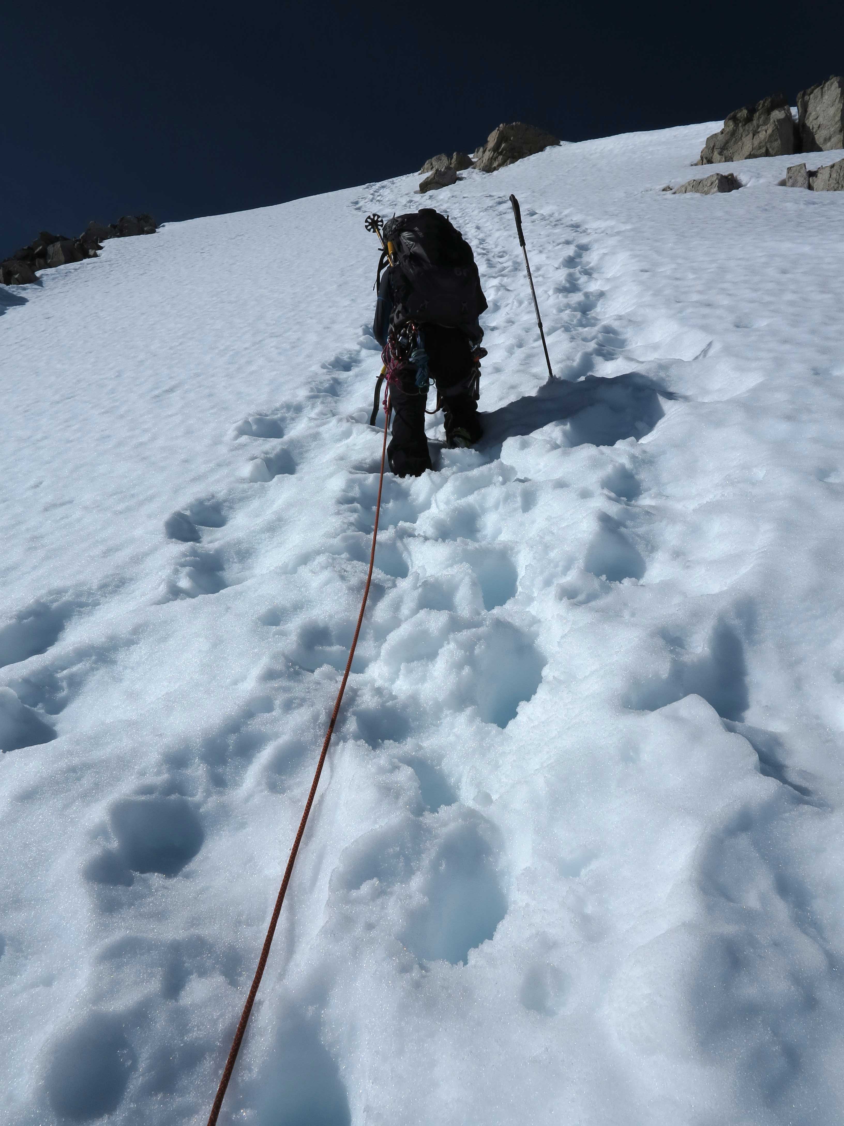 View down the glacier from the Arete Pass before making the final ascent up the Arete Ridge to the Wedge Mountain.