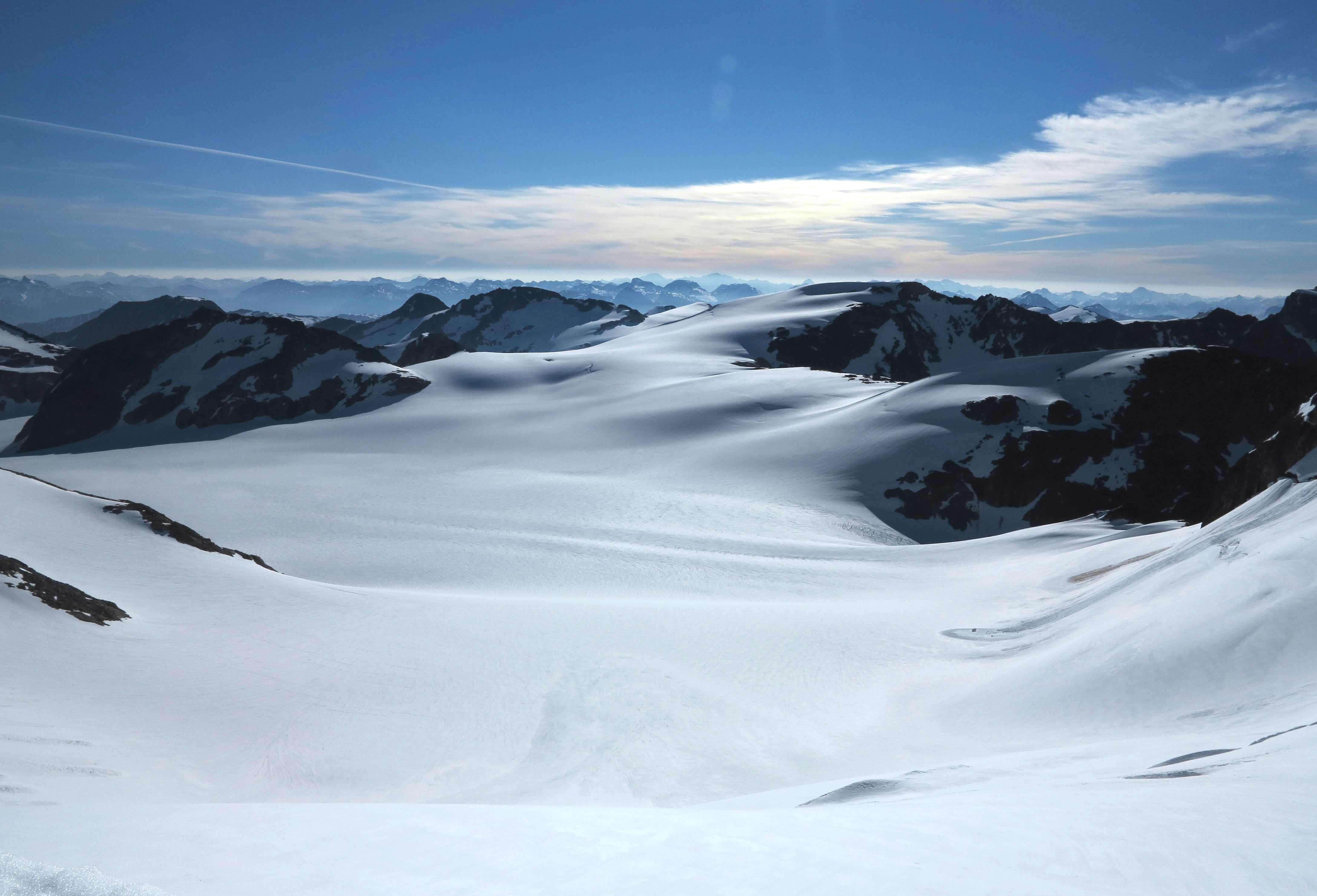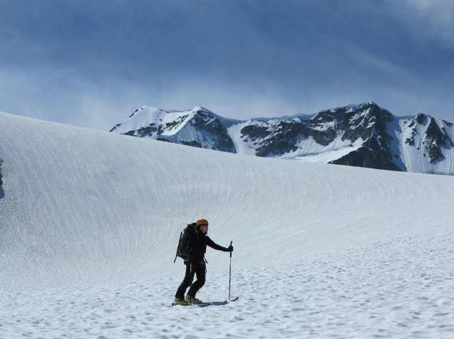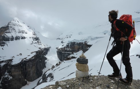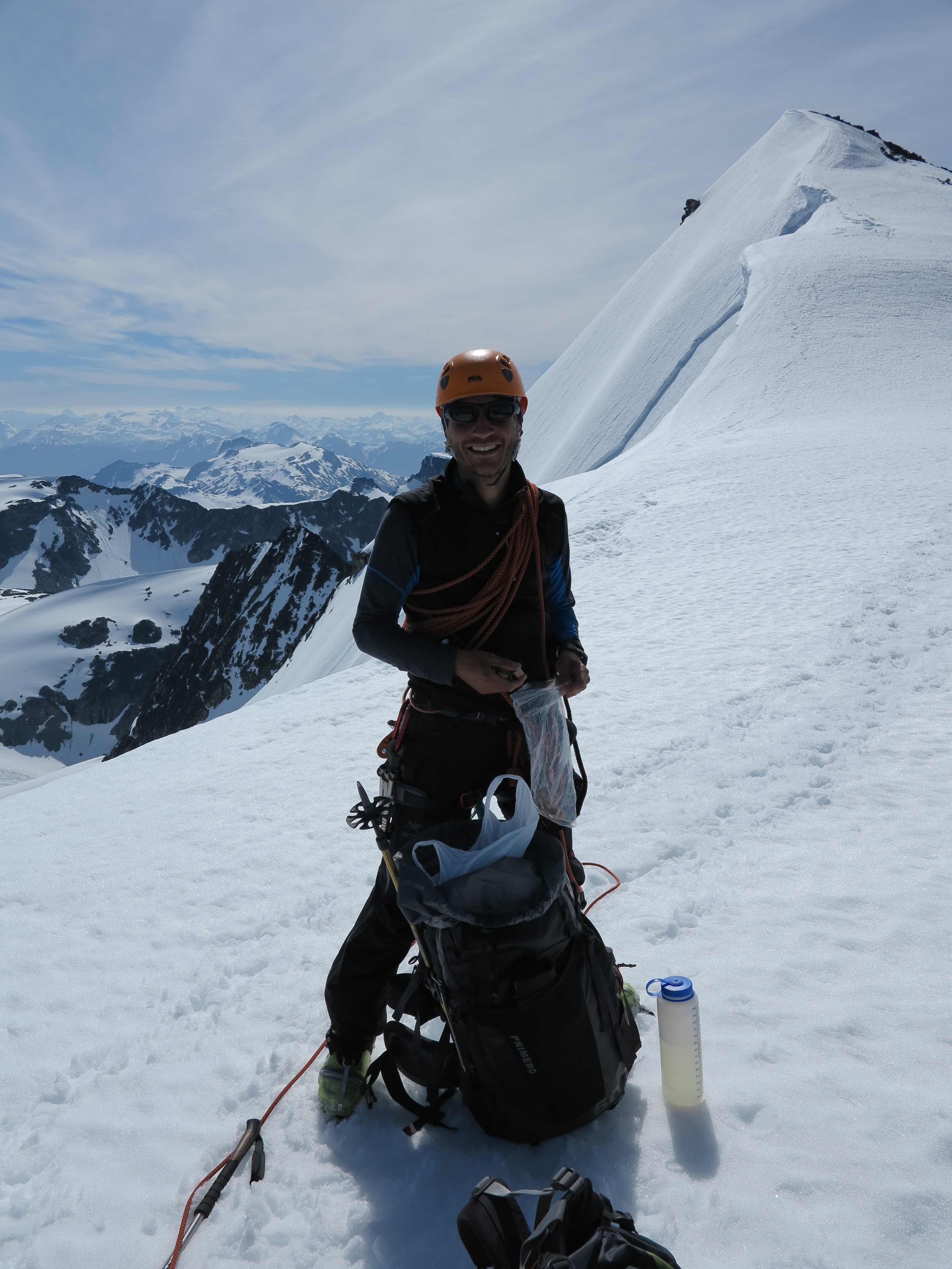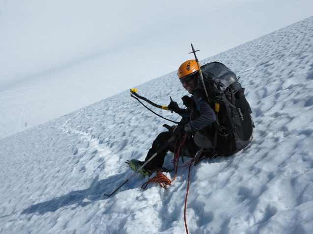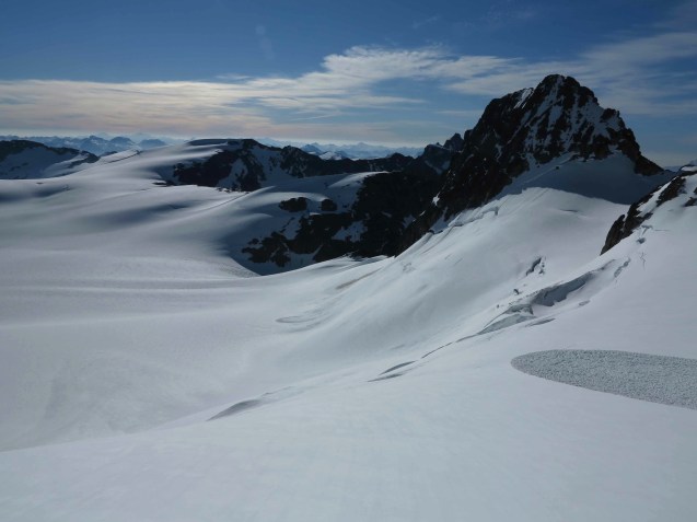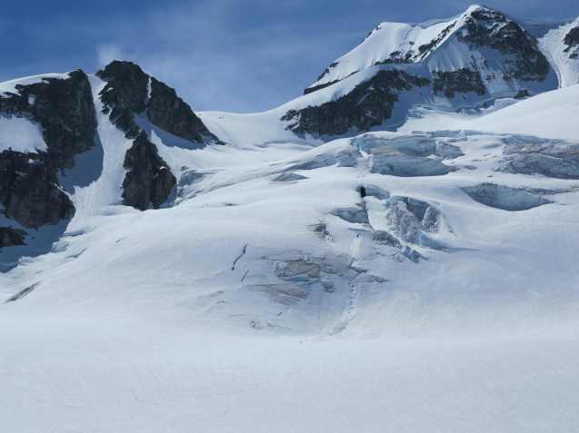 View down the glacier from the Arete Pass before making the final ascent up the Arete Ridge to the Wedge Mountain.