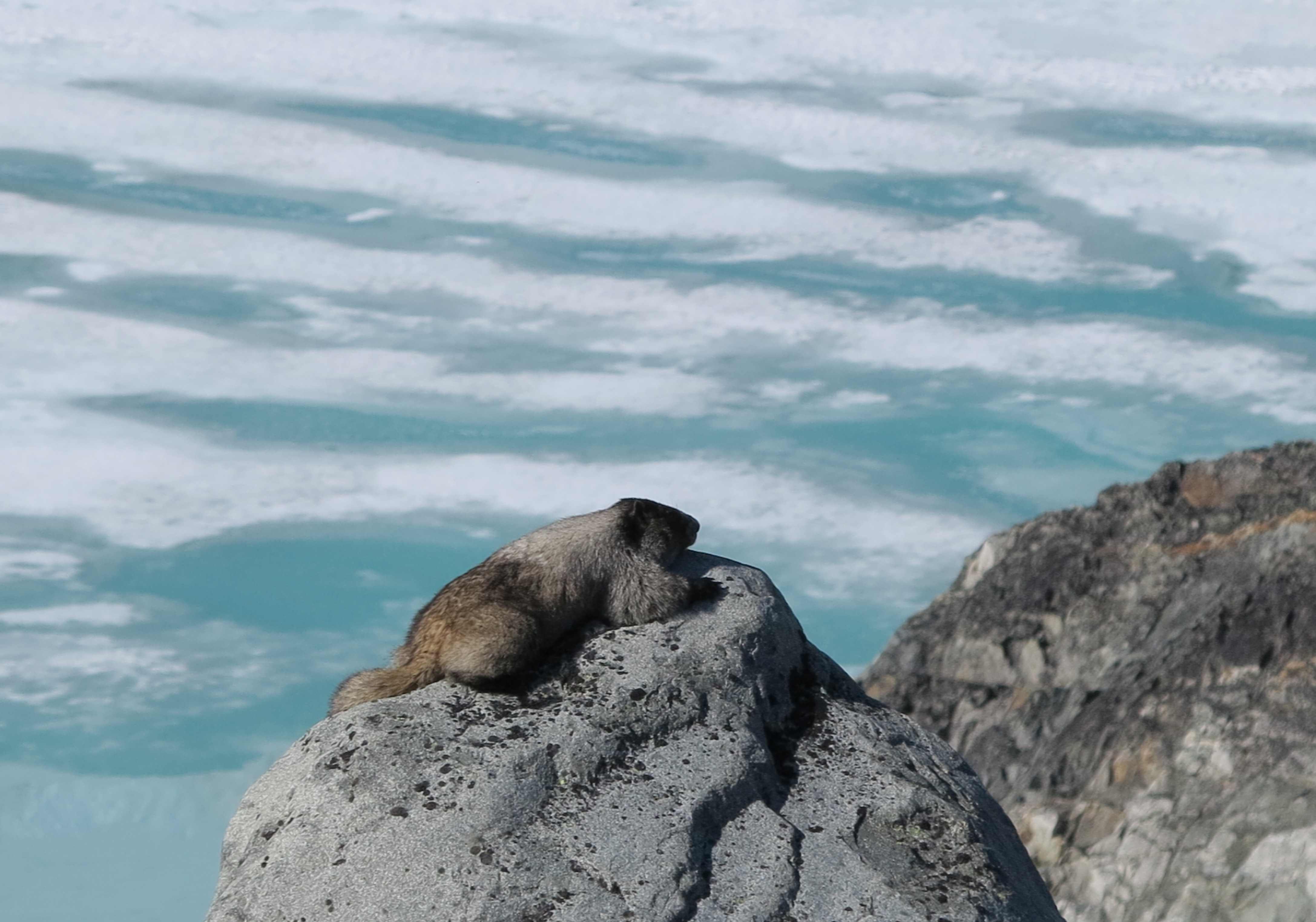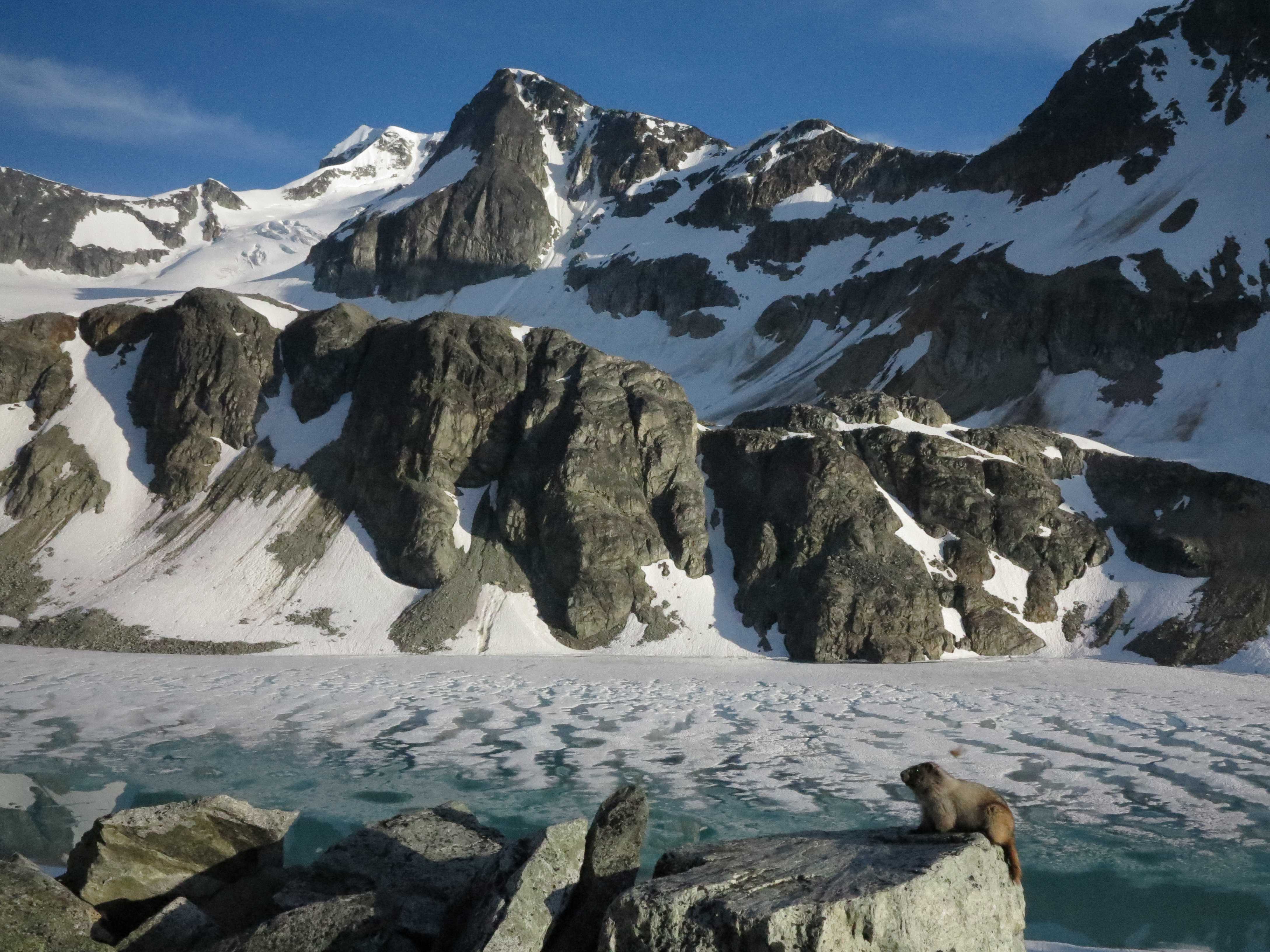 Wedgemount Lake with a view to Wedge Mountain (snow covered to the left) and with posing marmot.