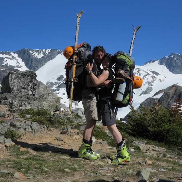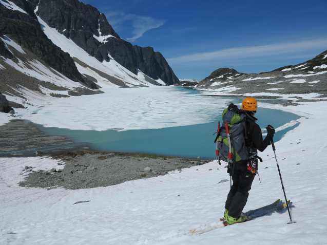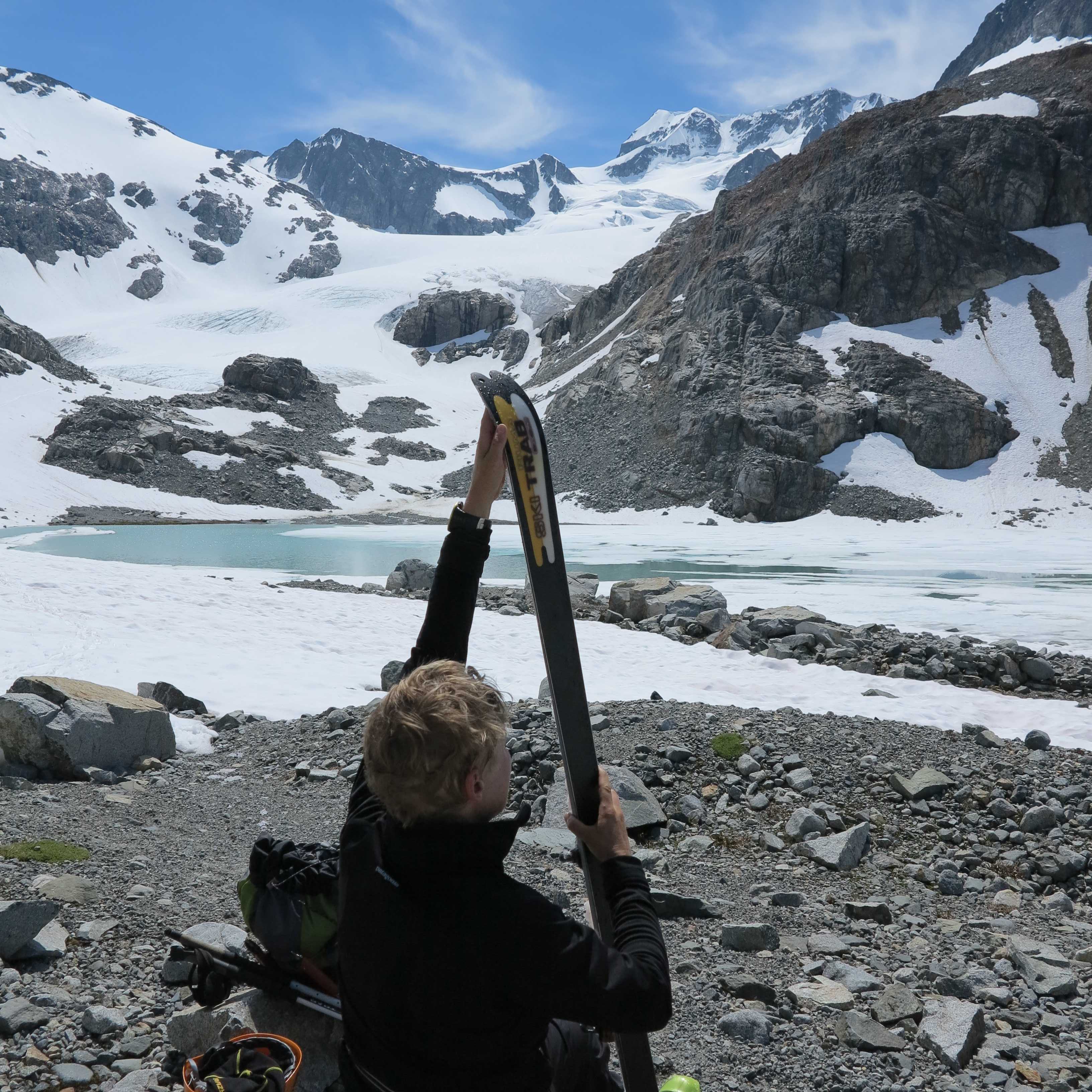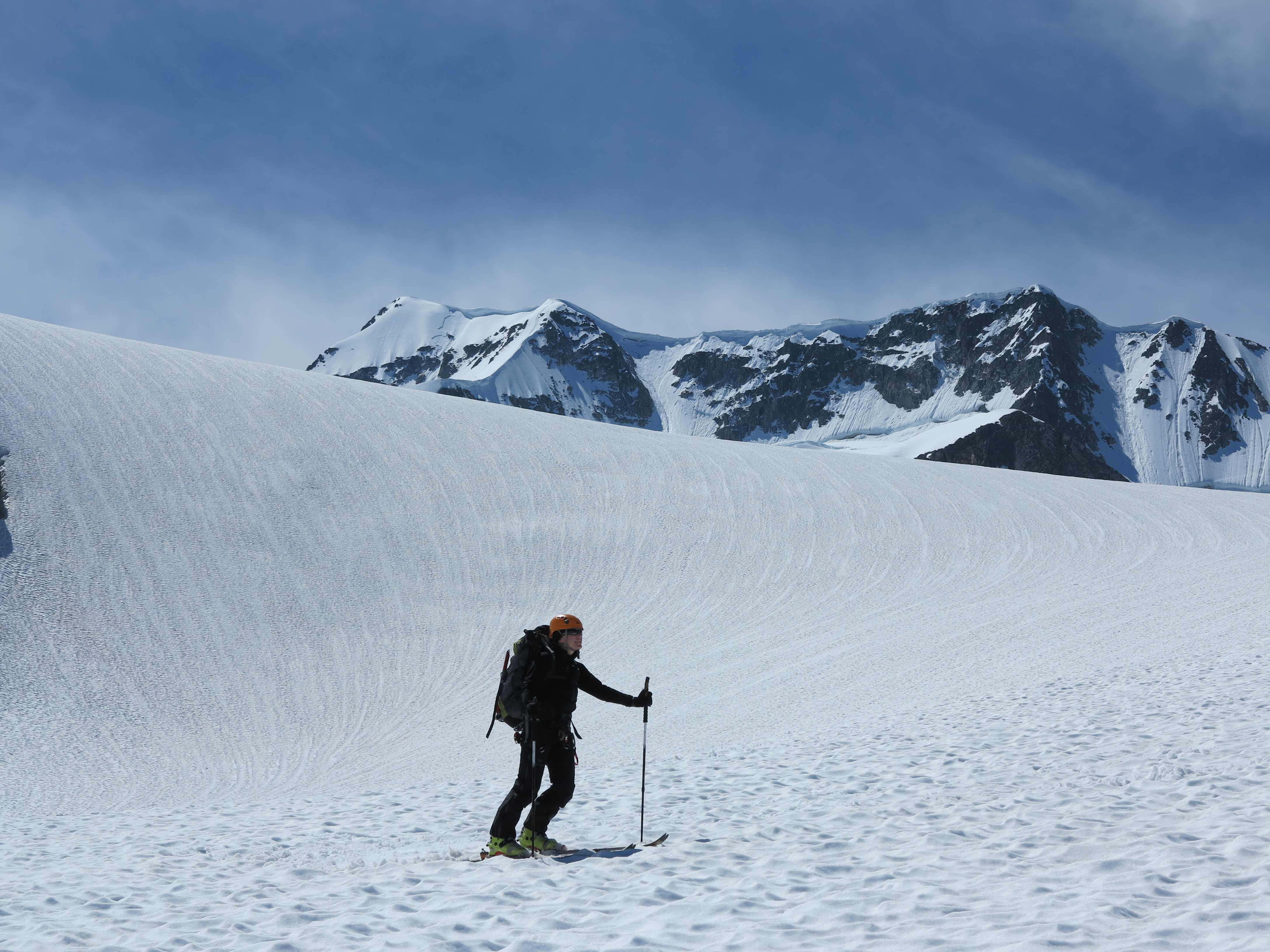 Skiing down the glacier and looking back at Wedge Mountain.
