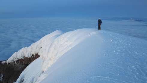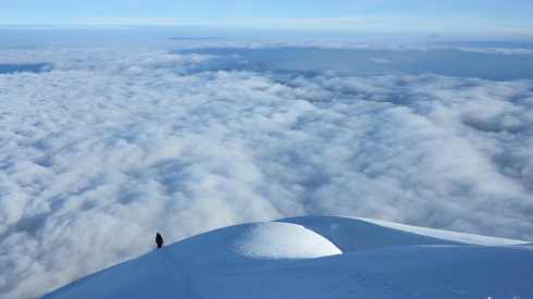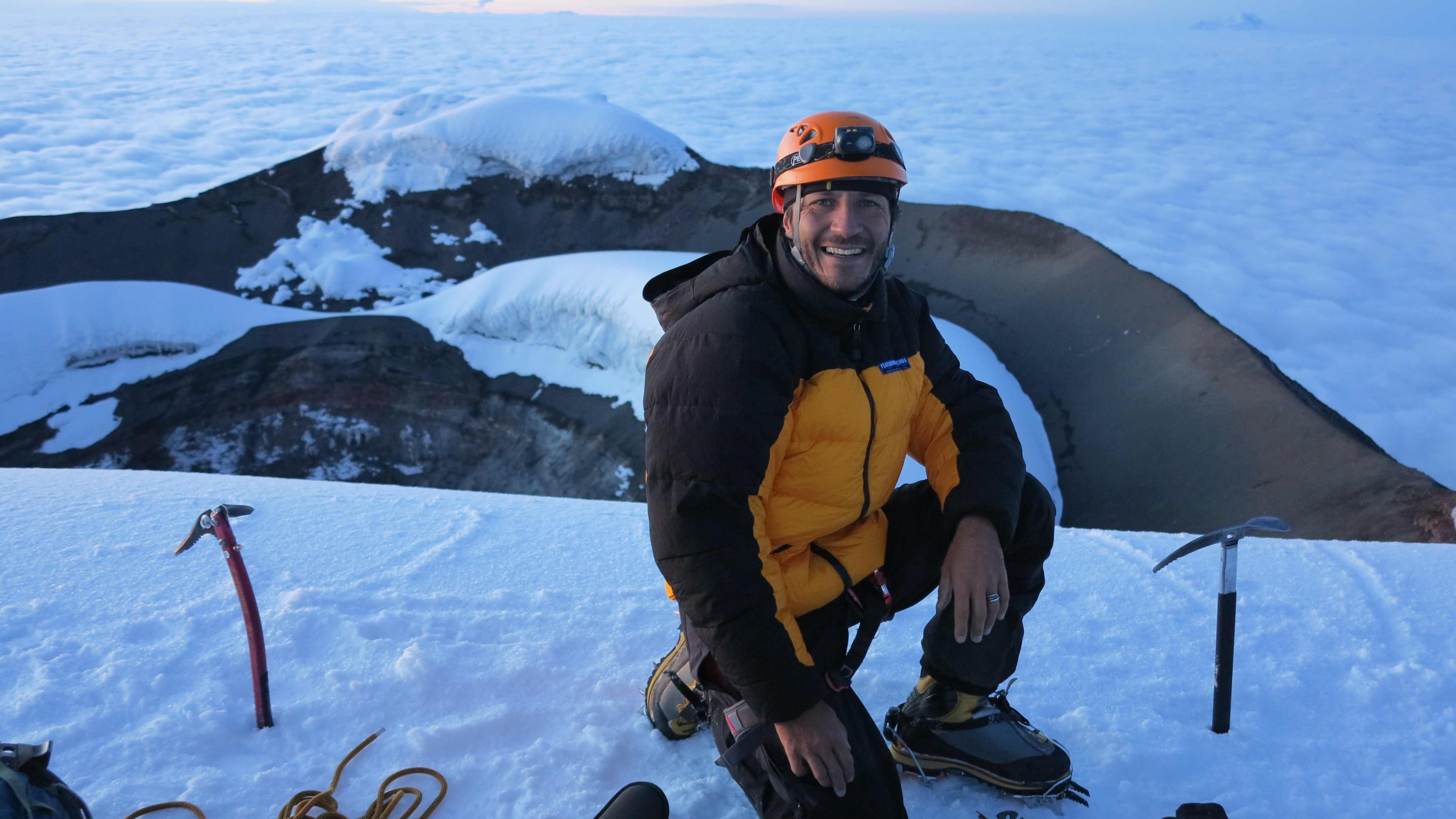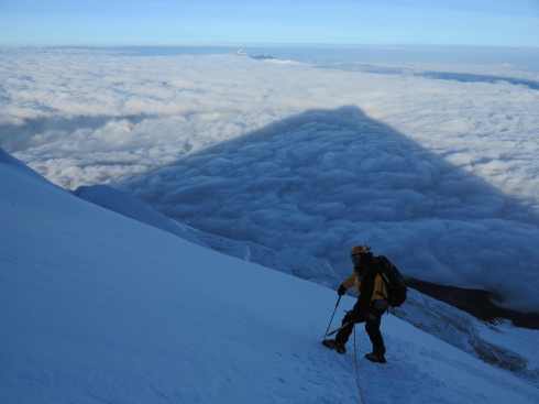Descent. Marco in the shadow of Cotopaxi with Illiniza Sur and Illiniza Norte in the far background.