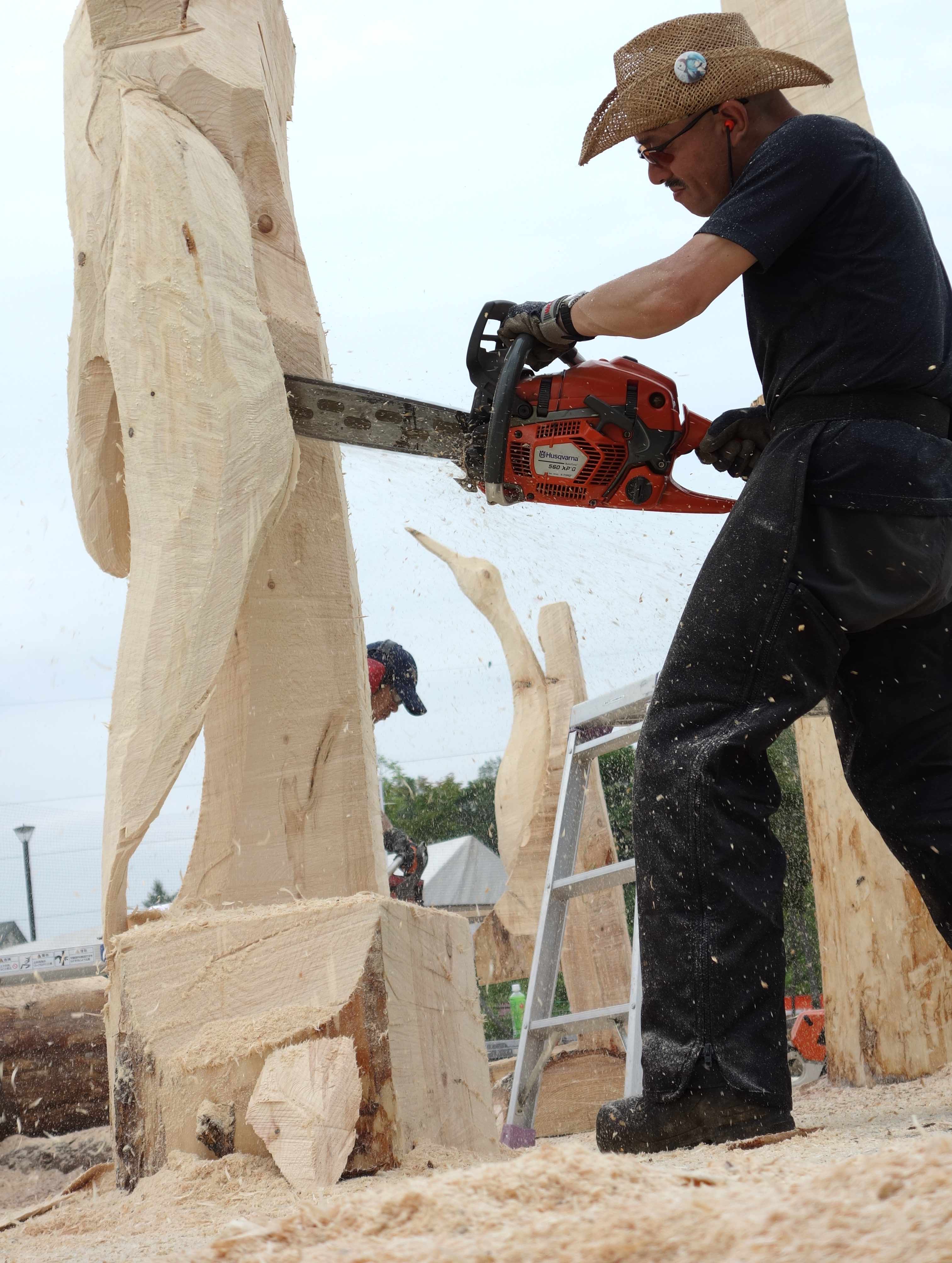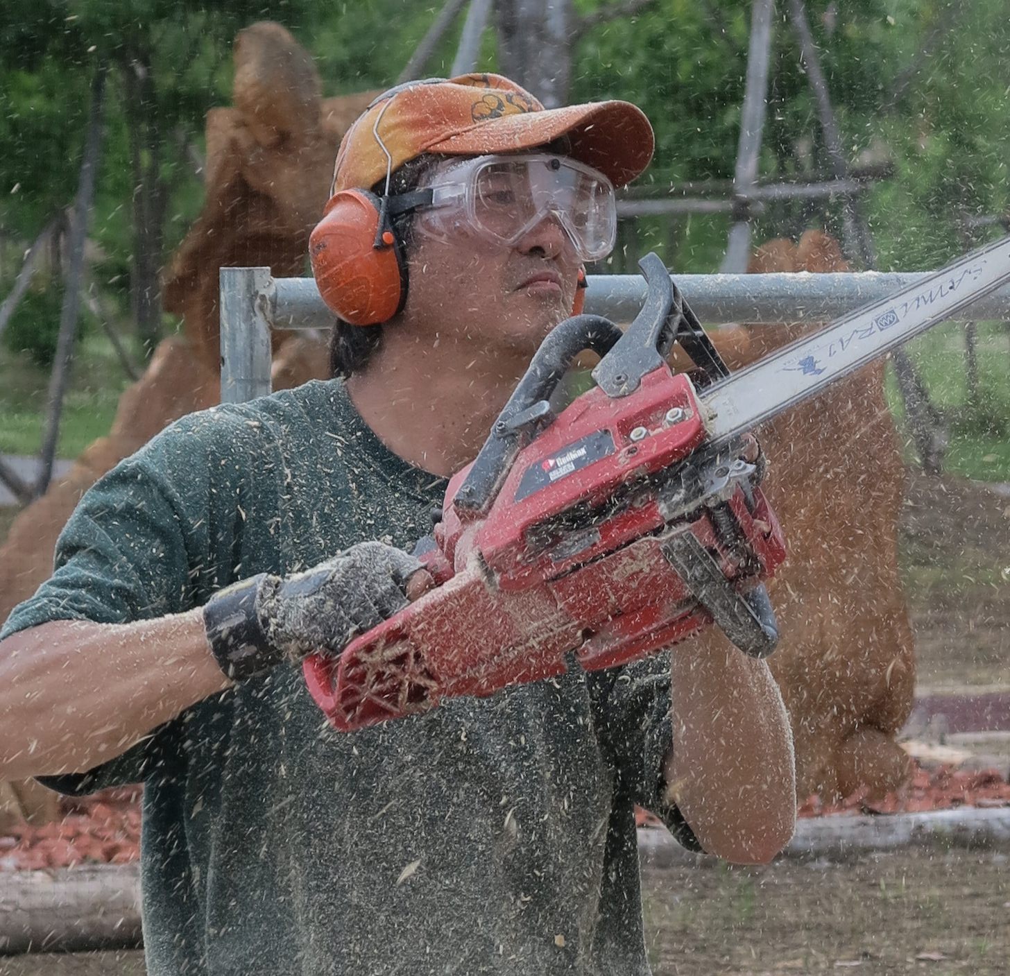 In northern Hokkaido we were lucky to run into two of the local summer festivals. The first one was the chainsaw masters competition in Shimokawa! The noise was deafening as about 10 men were working away with their chainsaws to create sculptures out of big logs of wood. They had 3 days to complete their work. We were there on the first day when the first rough work was done to cut the outline of the sculpture.