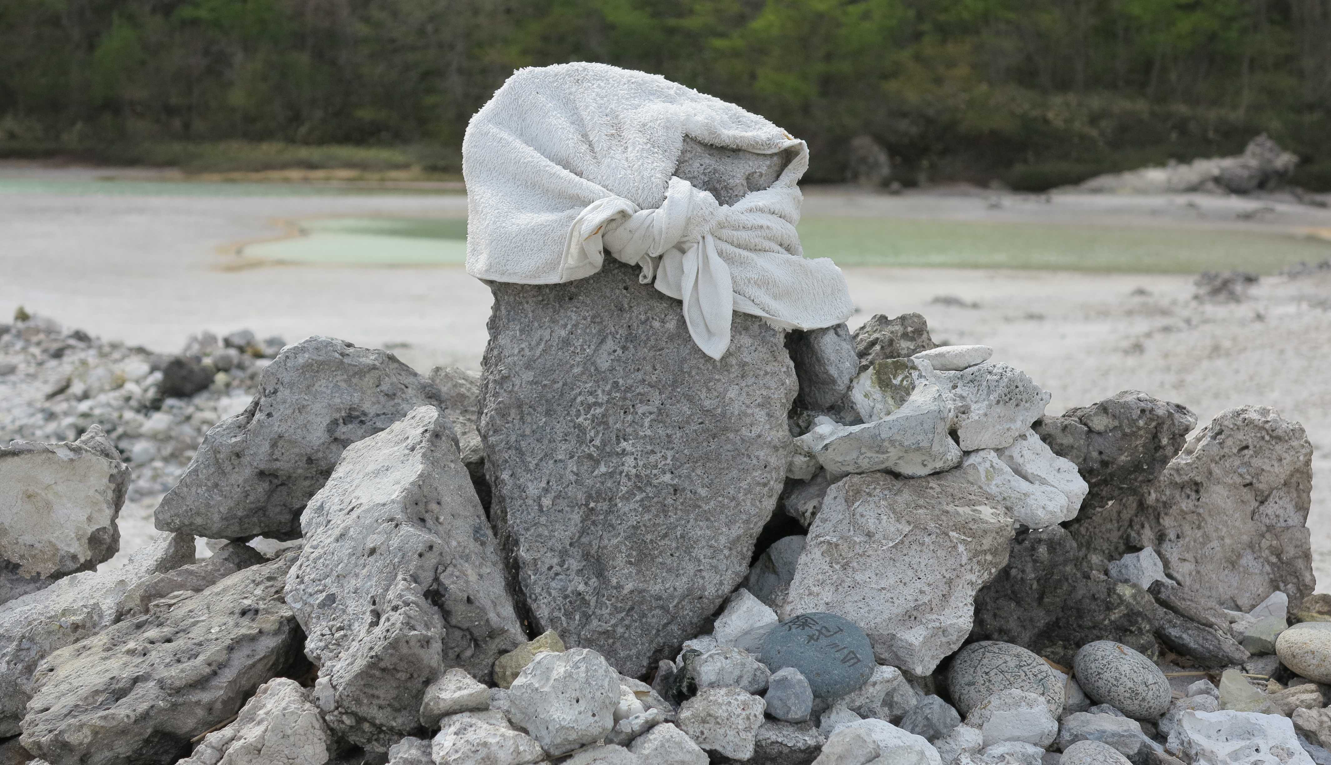 Osero-zan is guarded by Jizo, traditionally seen as the guadian of children and travellers. Lots of small Jizo statues can be seen in the crater of Osero-zan and often people are making offerings to them. According to Japanese ancient beliefs, the souls of children who die before their parents are unable to cross the mythical Sanzu River, because they have not had the chance to make enough good deeds in life and because they made their parents suffer. Every day, these children have to pile stones on the bank of the Sanzu River as a penalty – and every night, demons are destroying the stone piles again. At Osero-zan, one can see lots of stone piles along the shores of the crater lake and people passing are adding a couple of stones to the piles in order to help the children’s souls. Jizo is believed to save these unlucky children’s souls by hiding them from the demons in his robe.
