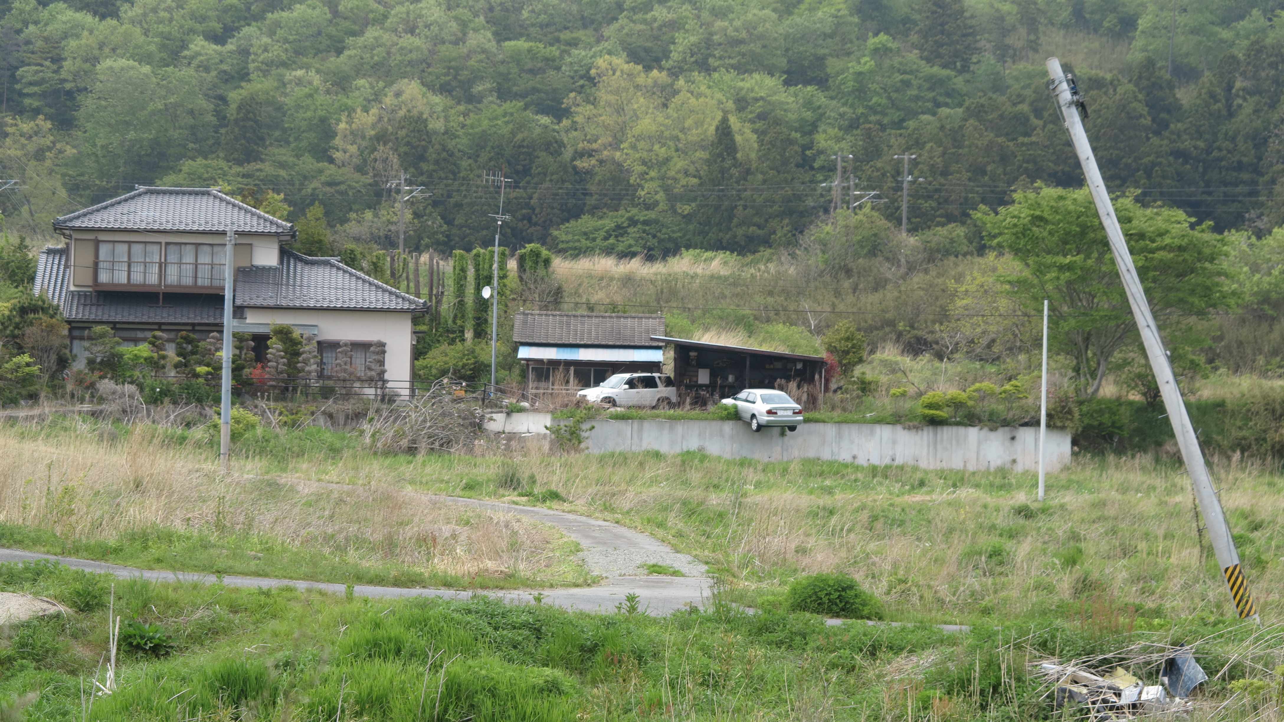 The first signs that we were entering the area of the tsunami came just north of the city of Iwaki. This is the area which is quite close to the Fukushima nuclear power plant and everything had been left as it was. All the houses were abandoned. The fields were growing wild and weeds were popping up through the concrete and the asphalt. Below, the house escaped the tsunami but notice the car which has been “parked” half way up the wall and the general state of disorder which jumps in your eyes because it is so unusual in Japan. IMG_9883_small
