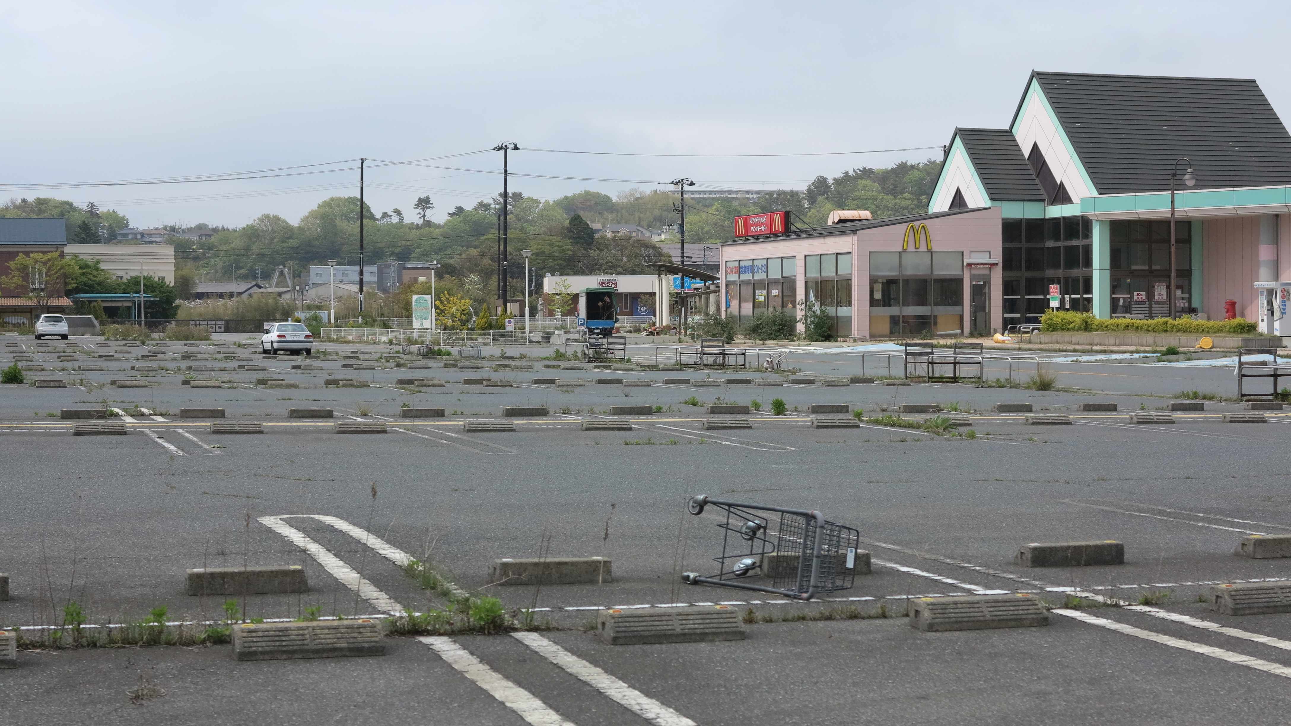 The parking lot of a supermarket and McDonalds. Shortly after passing through this abandoned area we found the road blocked by police. We had to turn around and make a big detour inland up to Sendai. IMG_9888_small