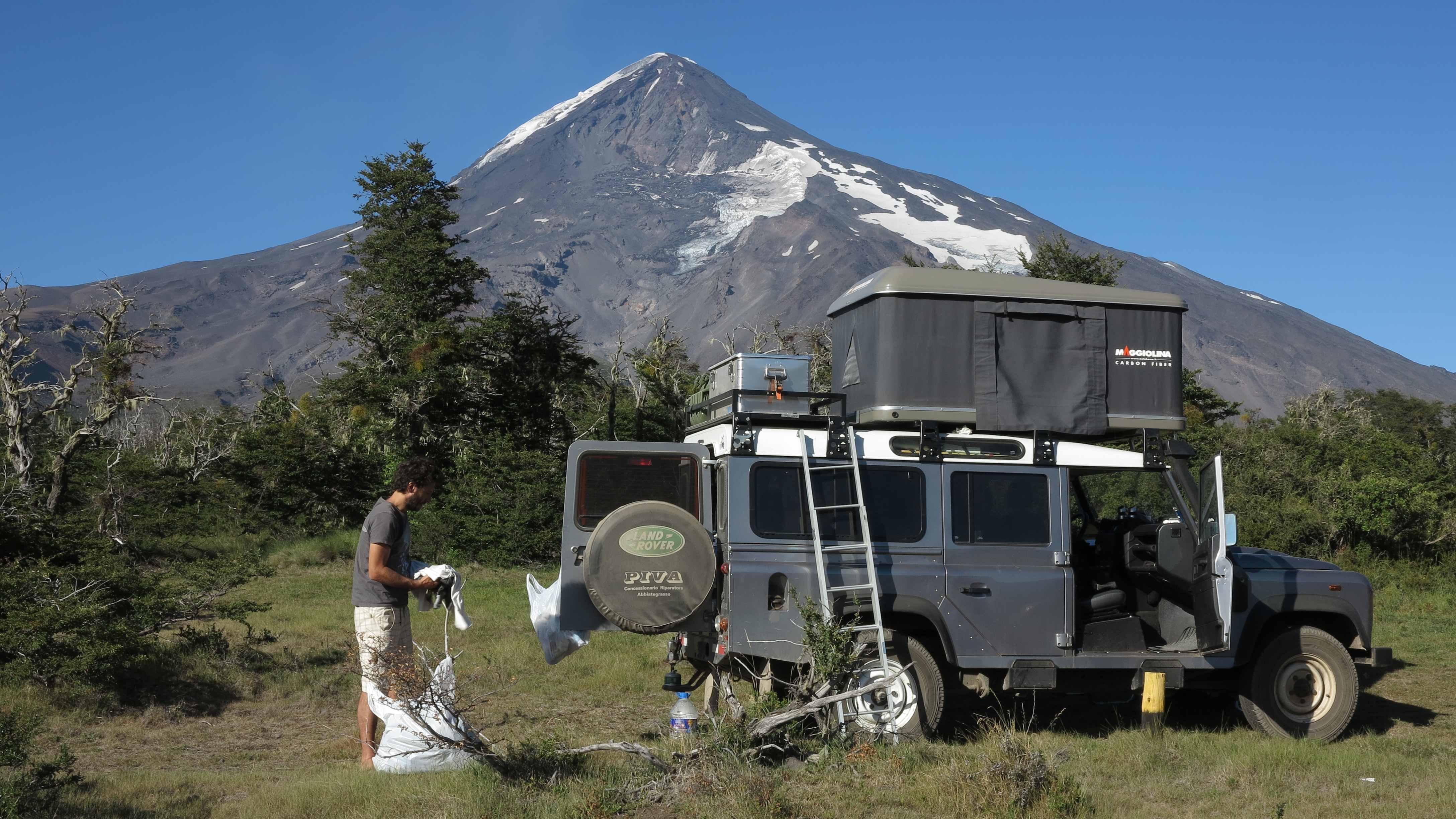 Frida parked at the foot of Volcan Lanin, 3747 m. Preparing to go for a hike the next day. Unfortunately we could not get the permit to go to the summit because we did not have a VHF radio!