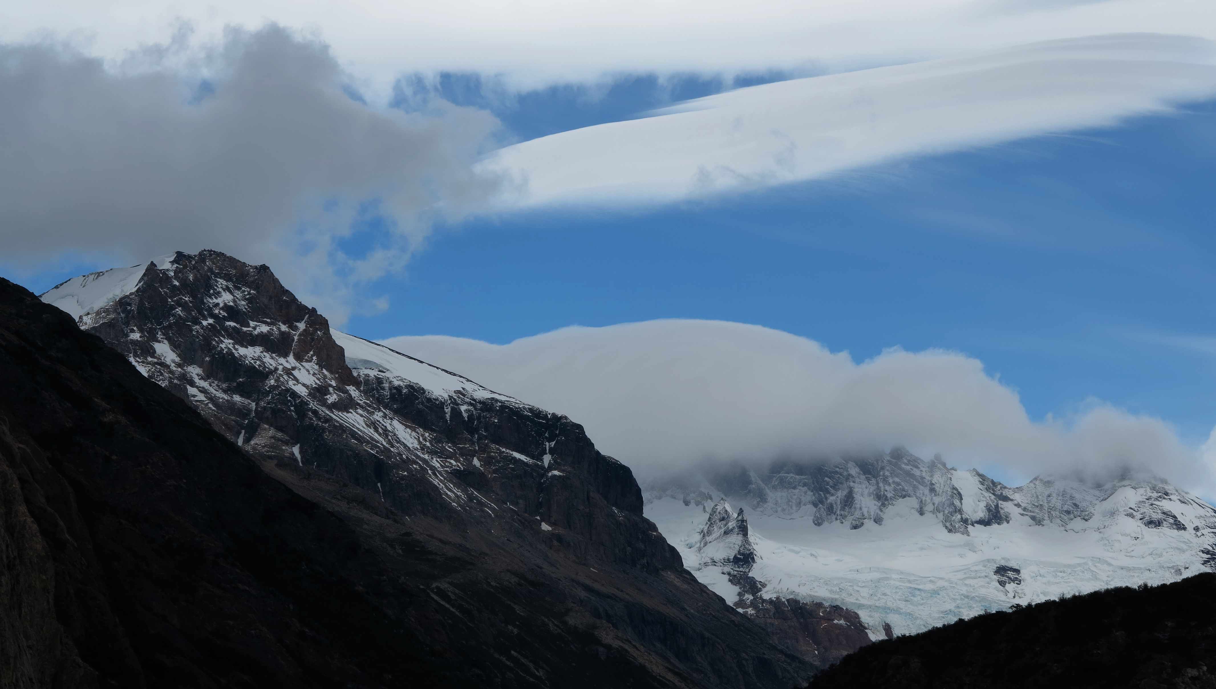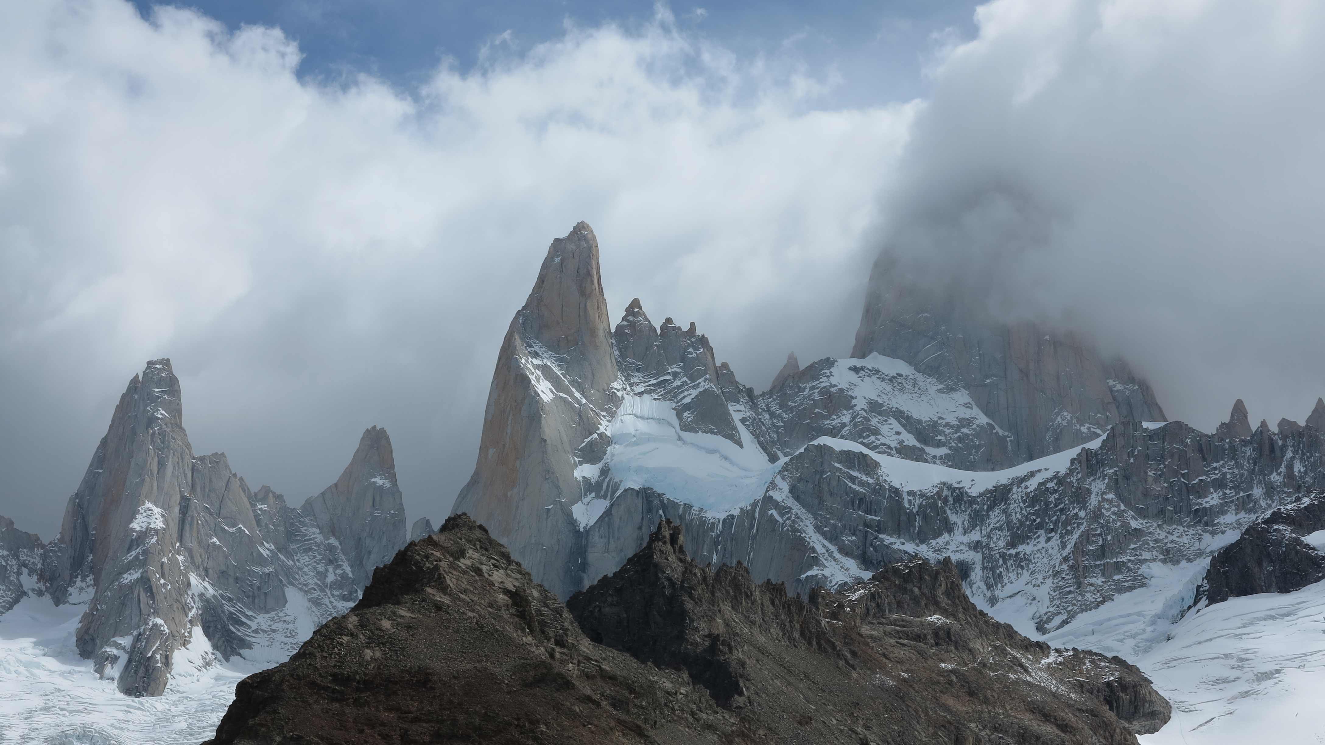 Clouds blowing off the granite peak of Monte Fitz Roy. To the left Cerro Poincenot and behind the Bifida.