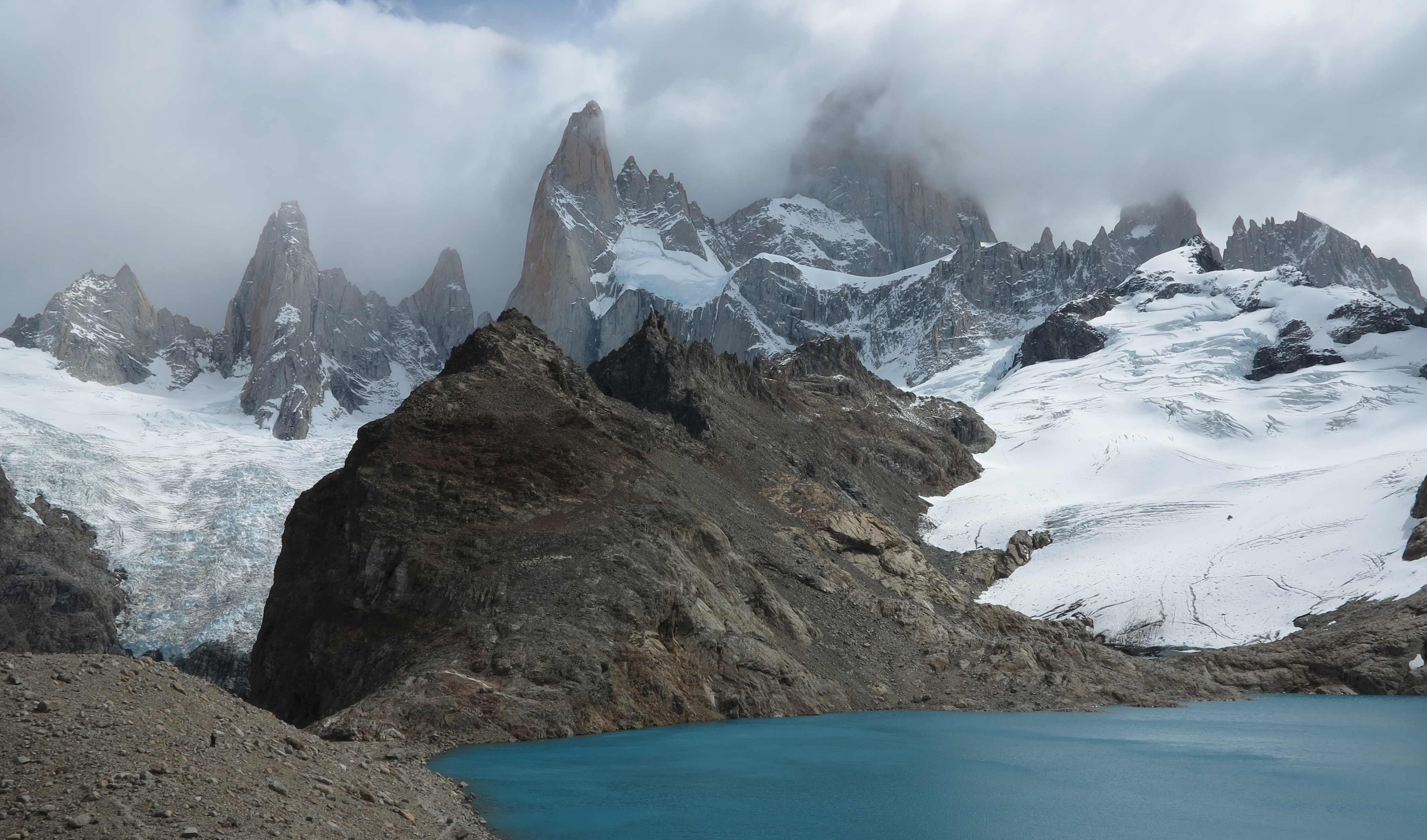 Laguna de Los Tres at the foot of the Glaciar de Los Tres. In the background Fitz Roy partly hidden in the clouds and to the left Cerro Poincenot and further left Ag. Saint Exupery.