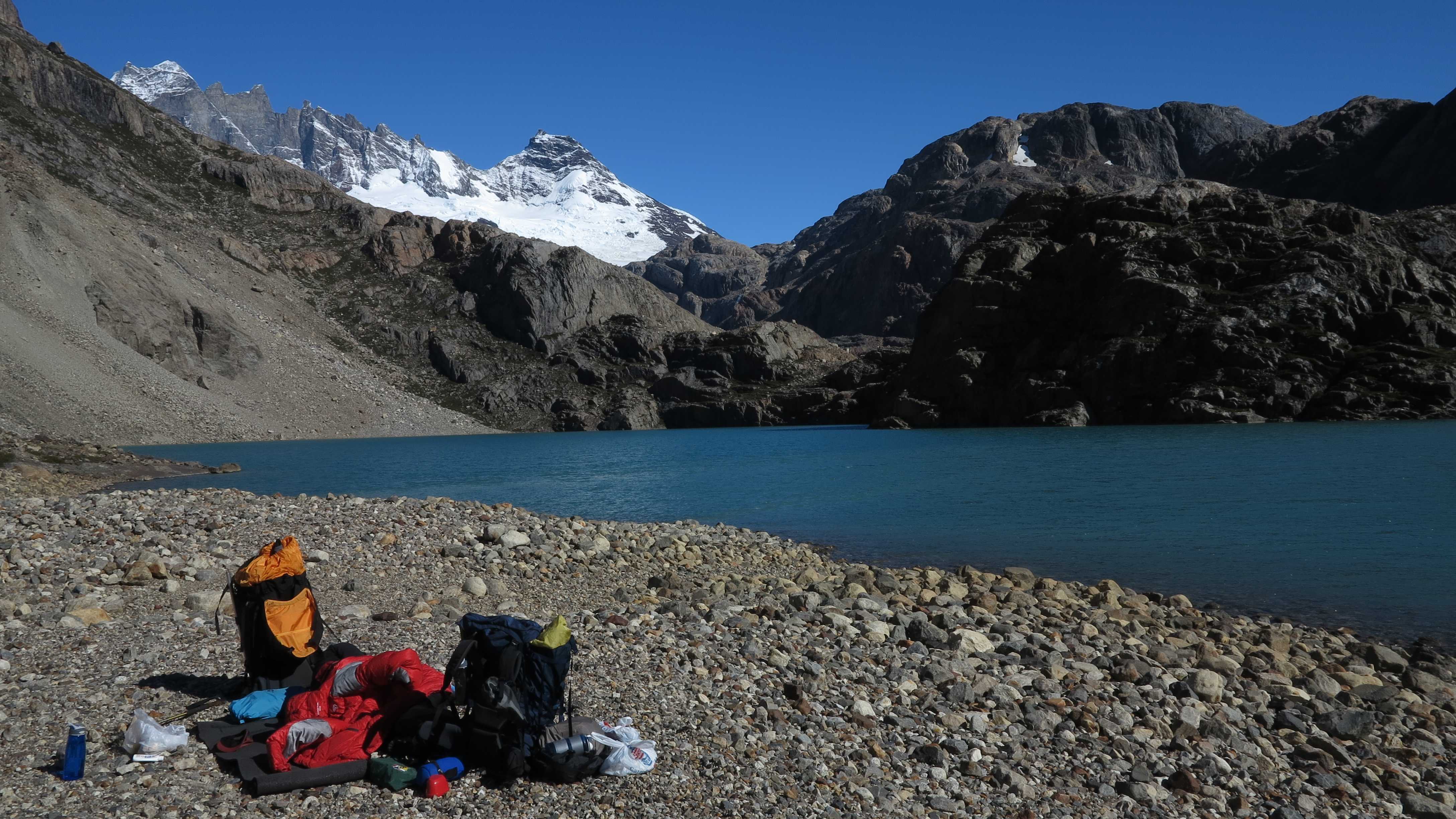 The great and noble alpinists spending the day on the beach – on the rocky shore of Lago Electrico.