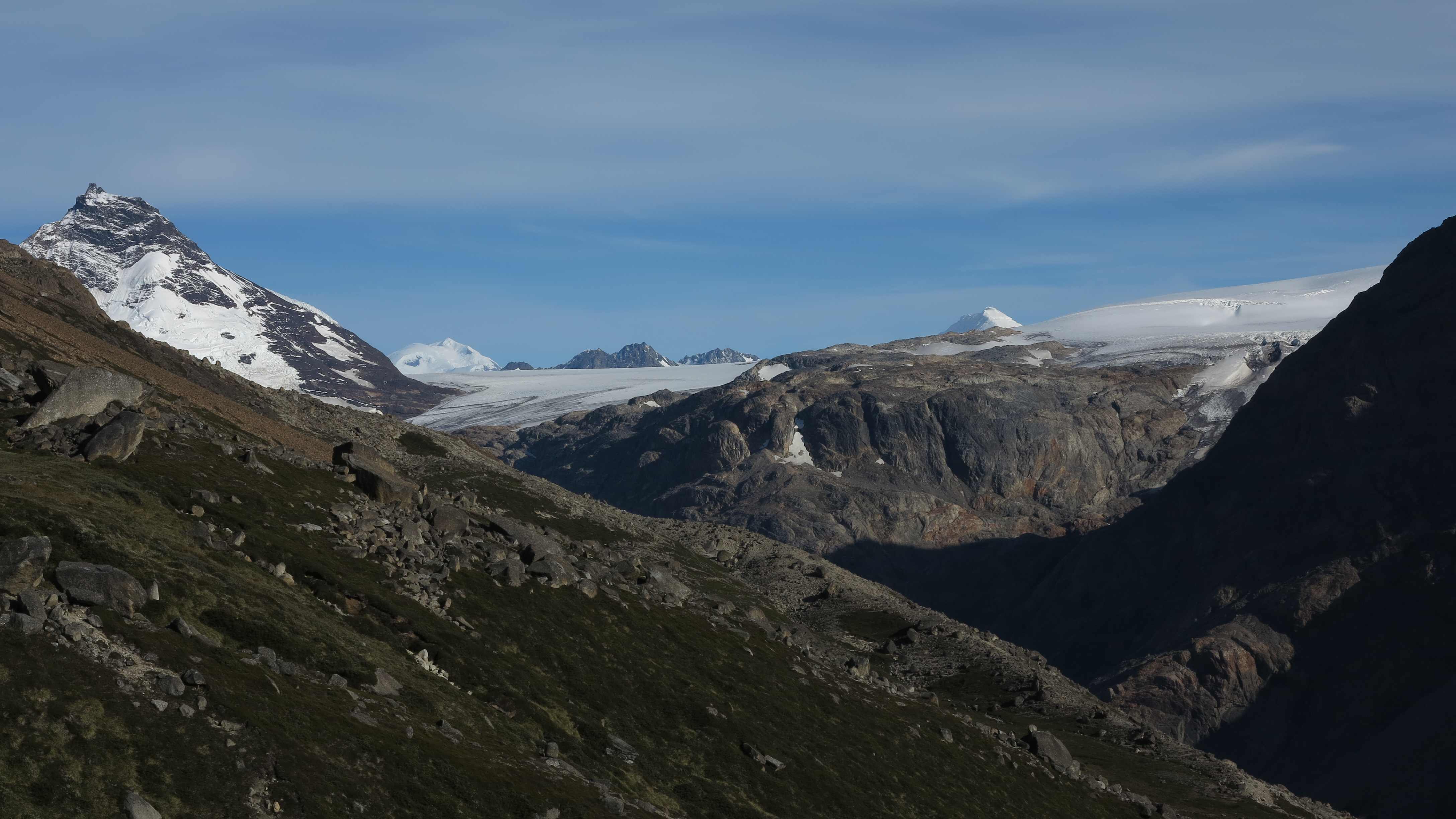 View to the continental ice sheet to the west, the third largest in the world after the ice caps on Antarctica and Greenland (Cerro Marconi to the left and Paso Marconi in the center).