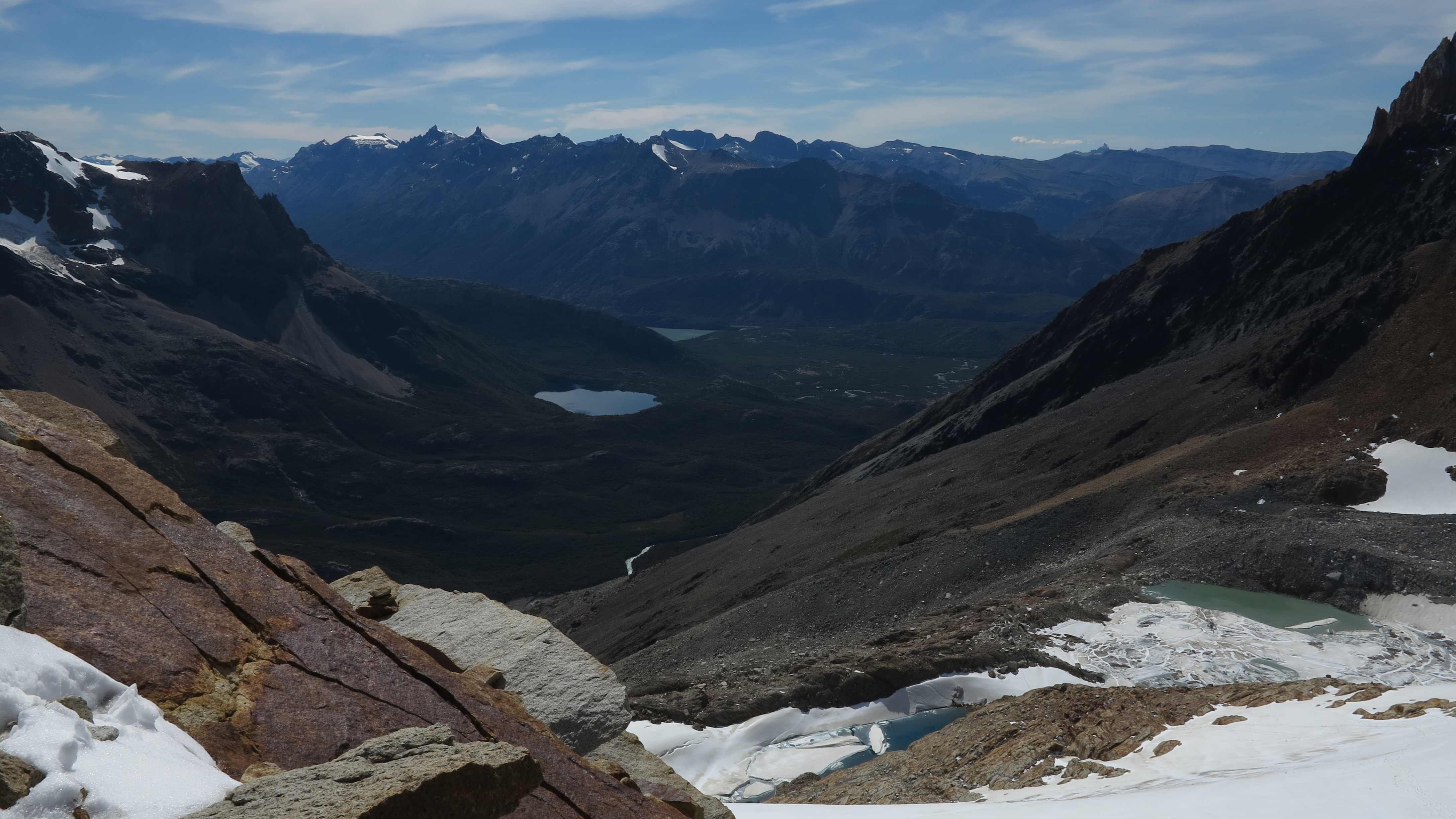 Just below the Paso del Cuadrado we had a lovely view across a small glacial lake to Ag. Guillaumet, Ag. Mermoz and Monte Fitz Roy.