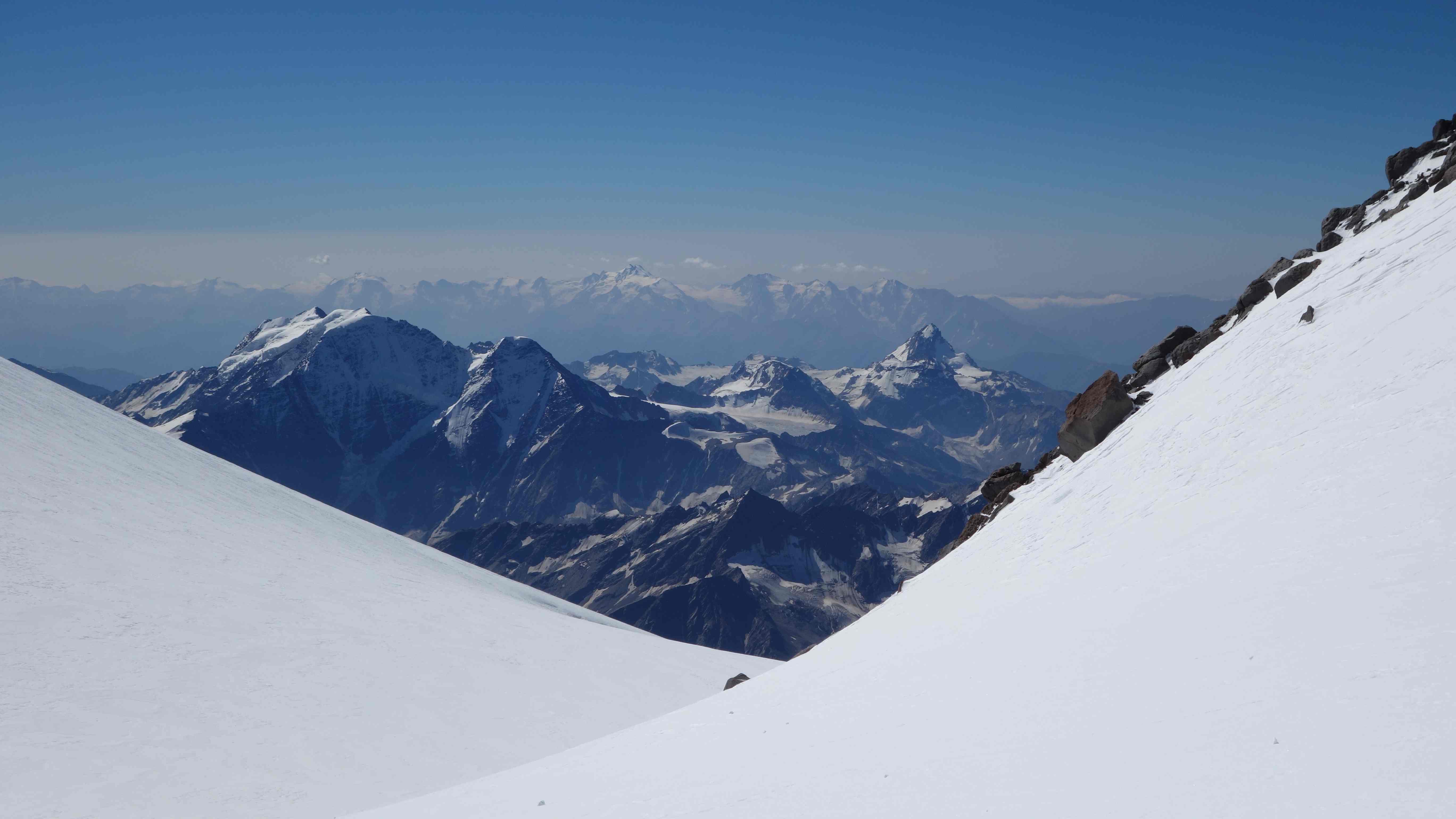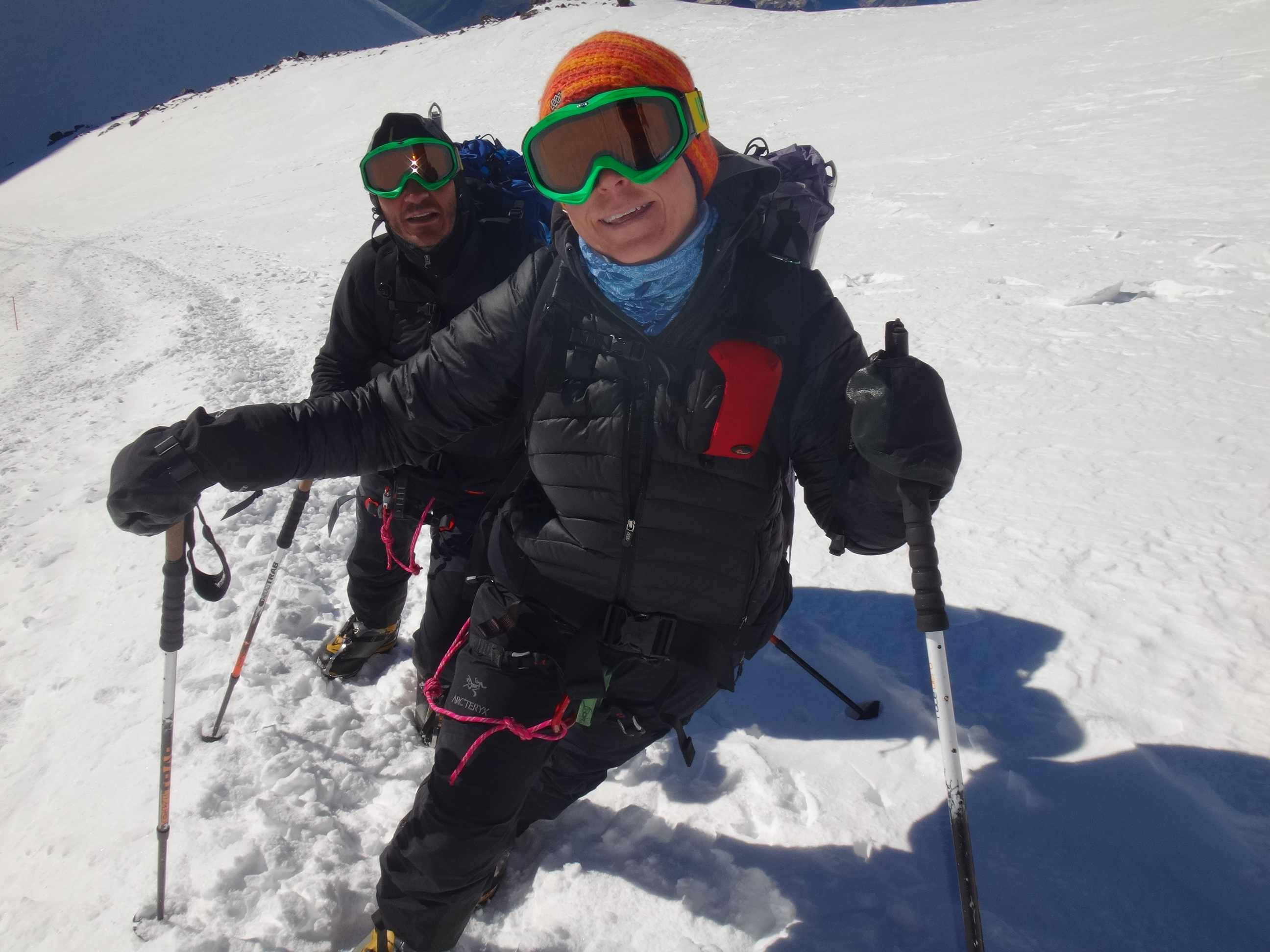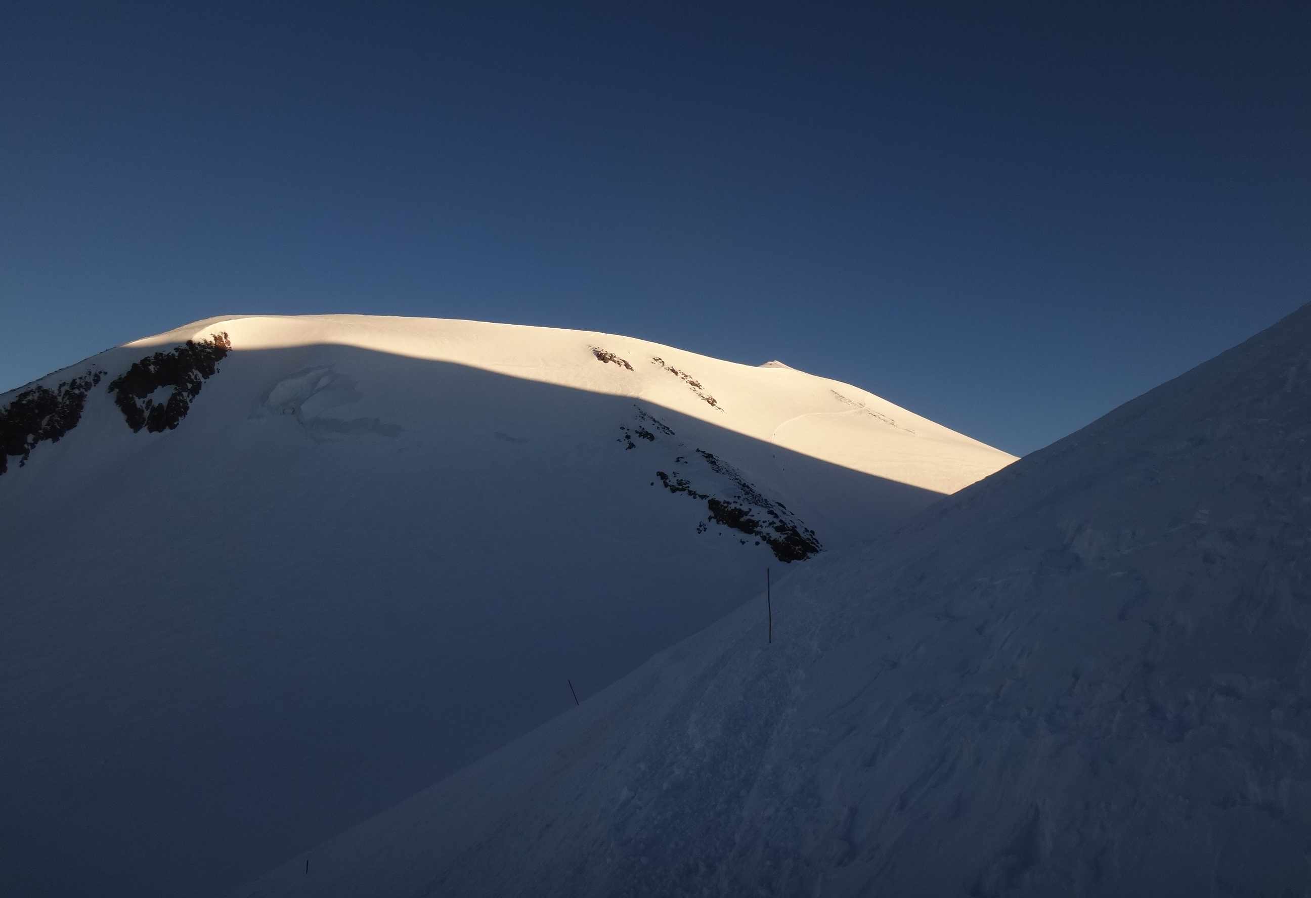 Summit day arrived. We left base camp at 2 am and took the snow cat up to the Pashtuhova Rocks at 4,670 m. From there we started the steep traverse across the base of the east summit. Here the sun is just rising to the east. The weather was brilliant.