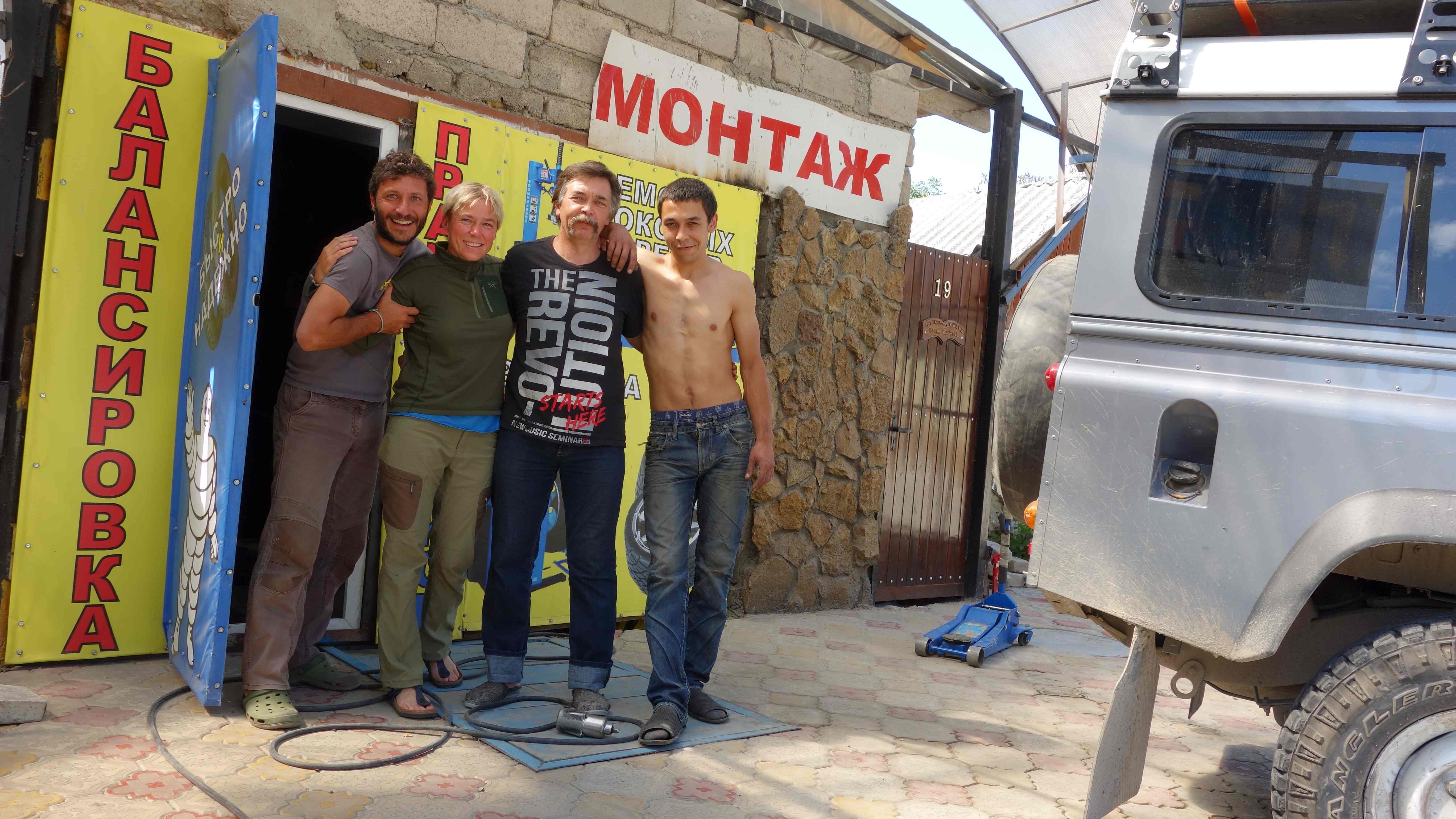 Edvard (to the far right) and his father Albert at their tire repair shop i Kislovodsk. Great guys who did a great job!!!