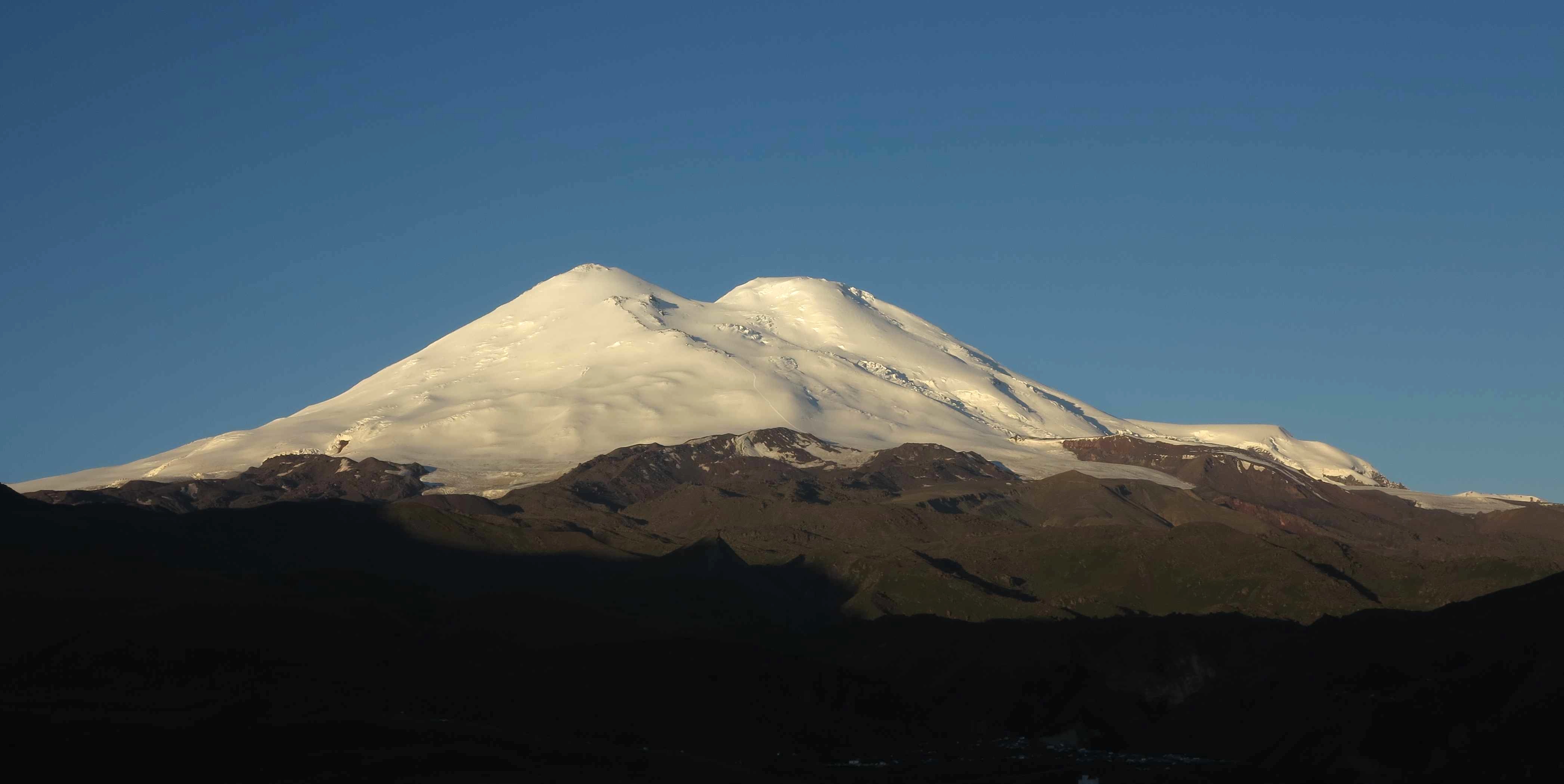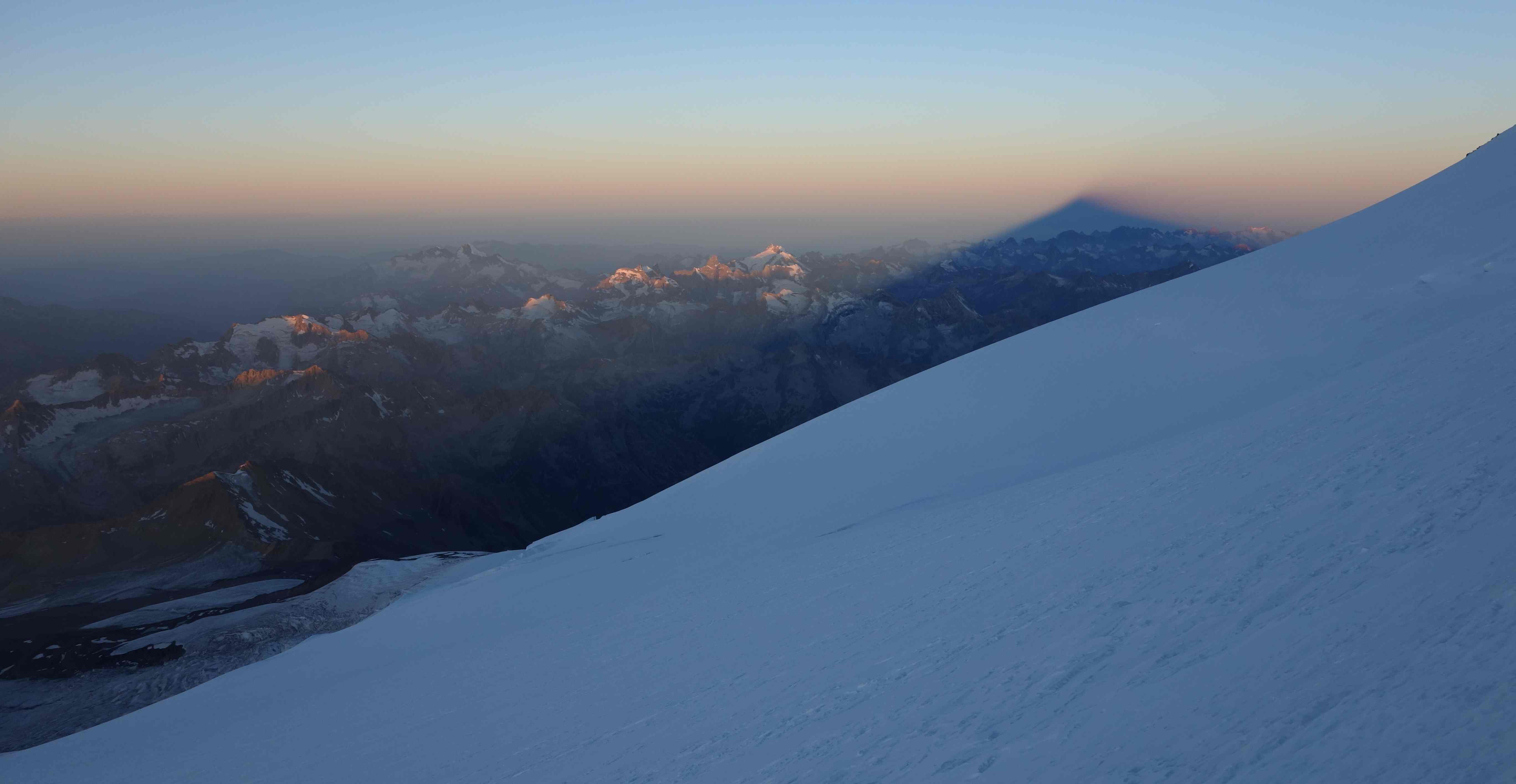 Shadow of the main summit of Elbrus cast by the rising sun.