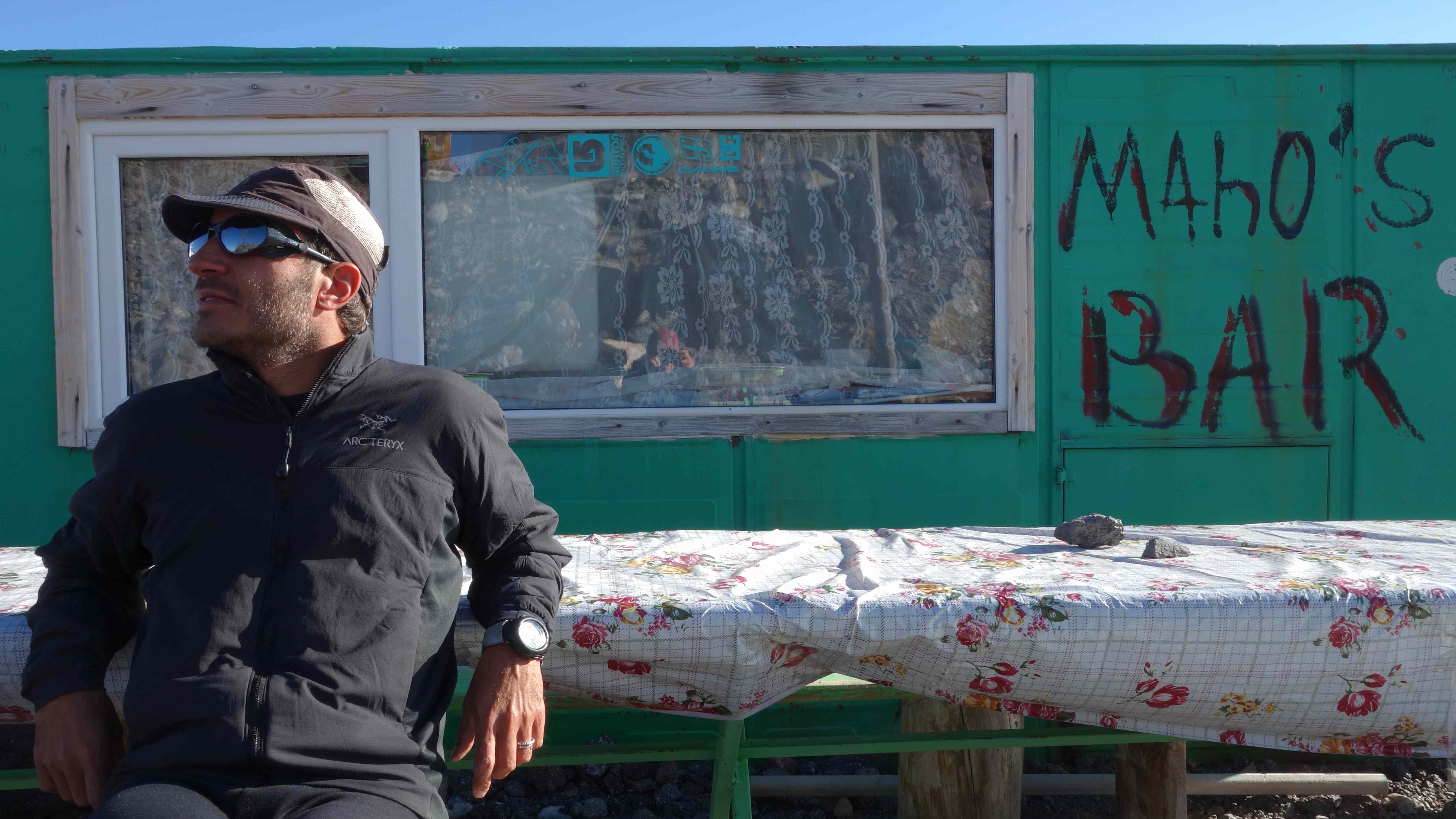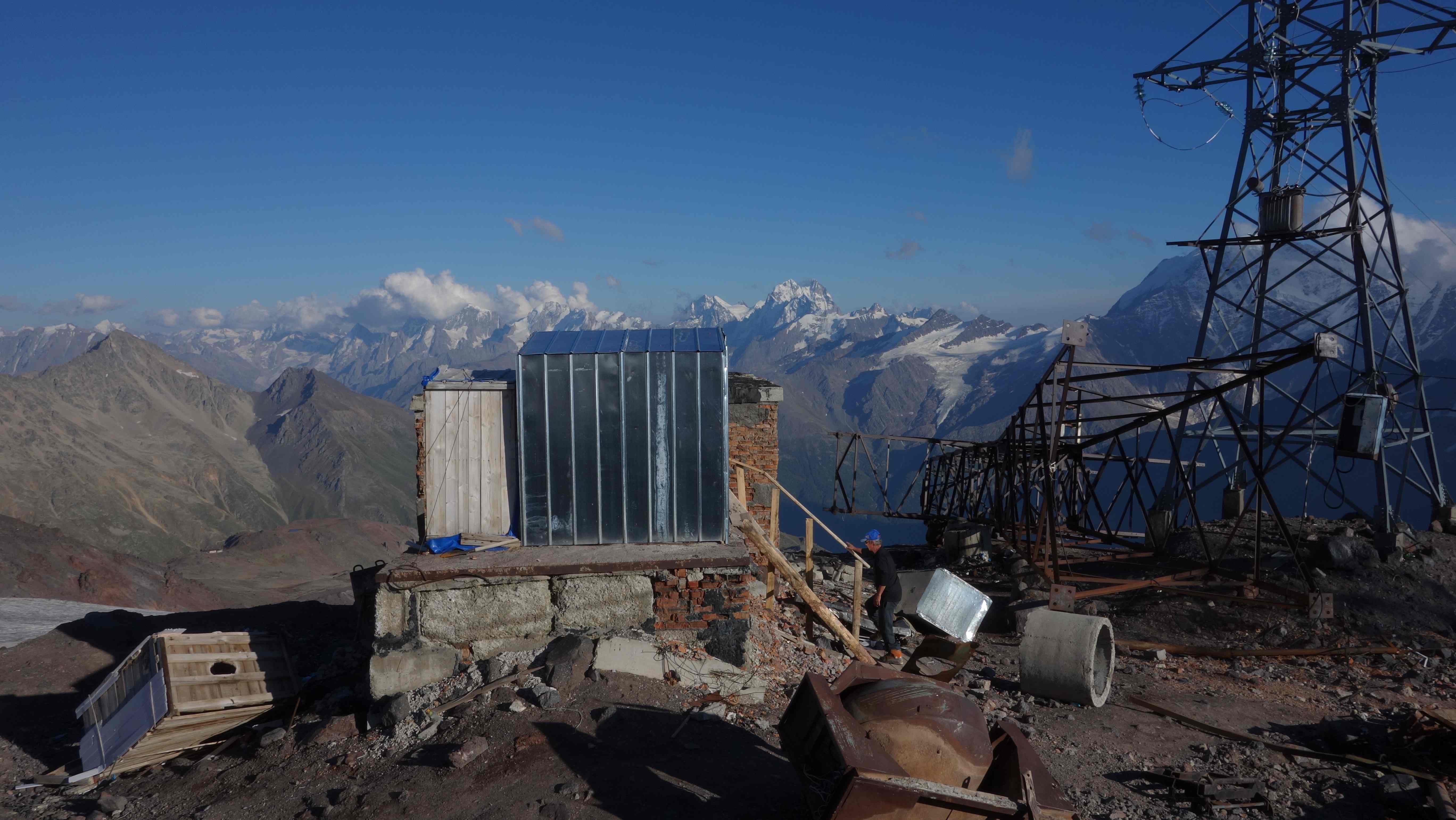 Japanese team-member Ken outside our accommodation with a view to Mt Elbrus and the toilets.