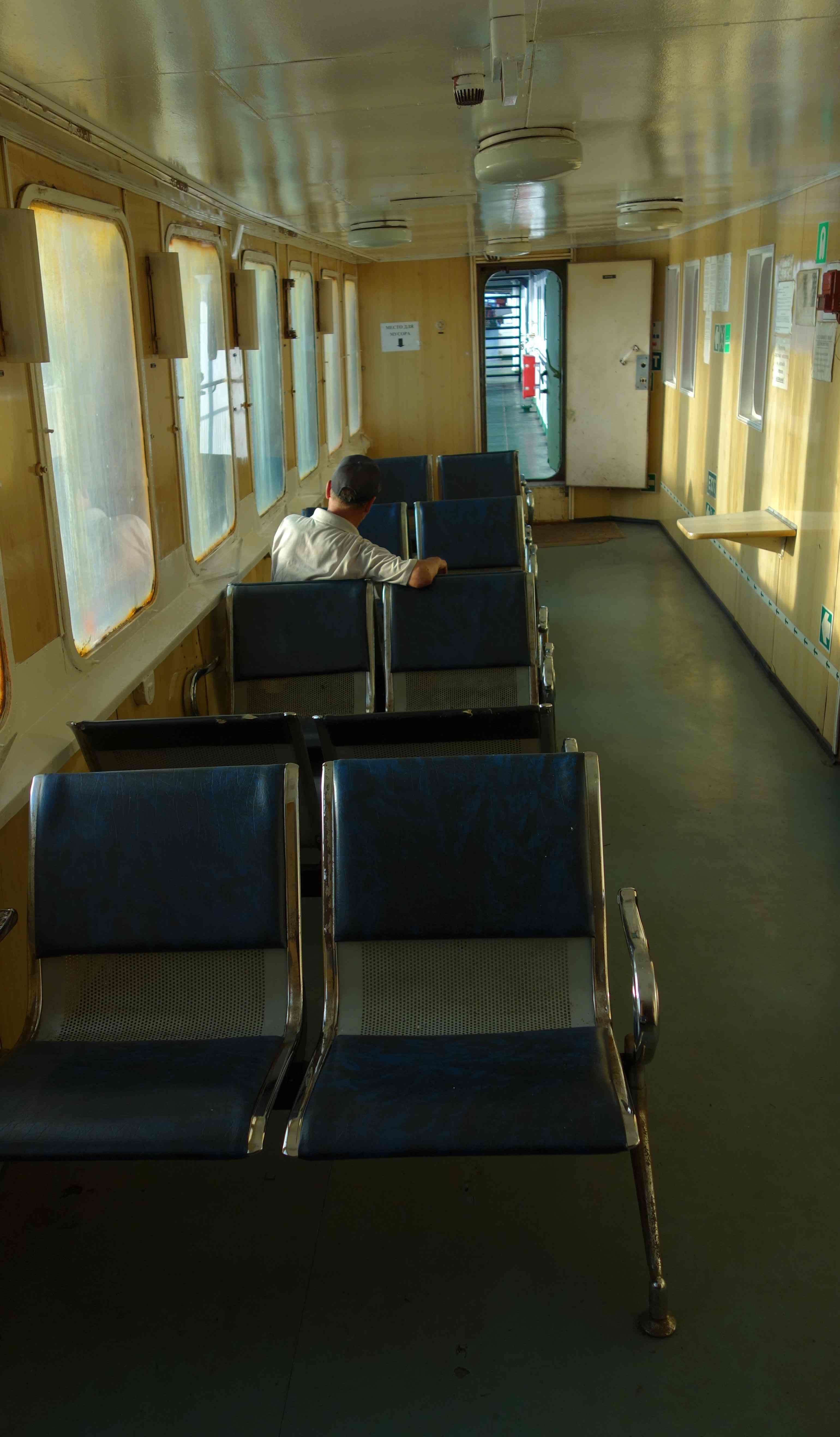 The ferry is actually a train ferry but it takes also trucks and passenger cars. It is quite dark and grim down below on the train deck.
