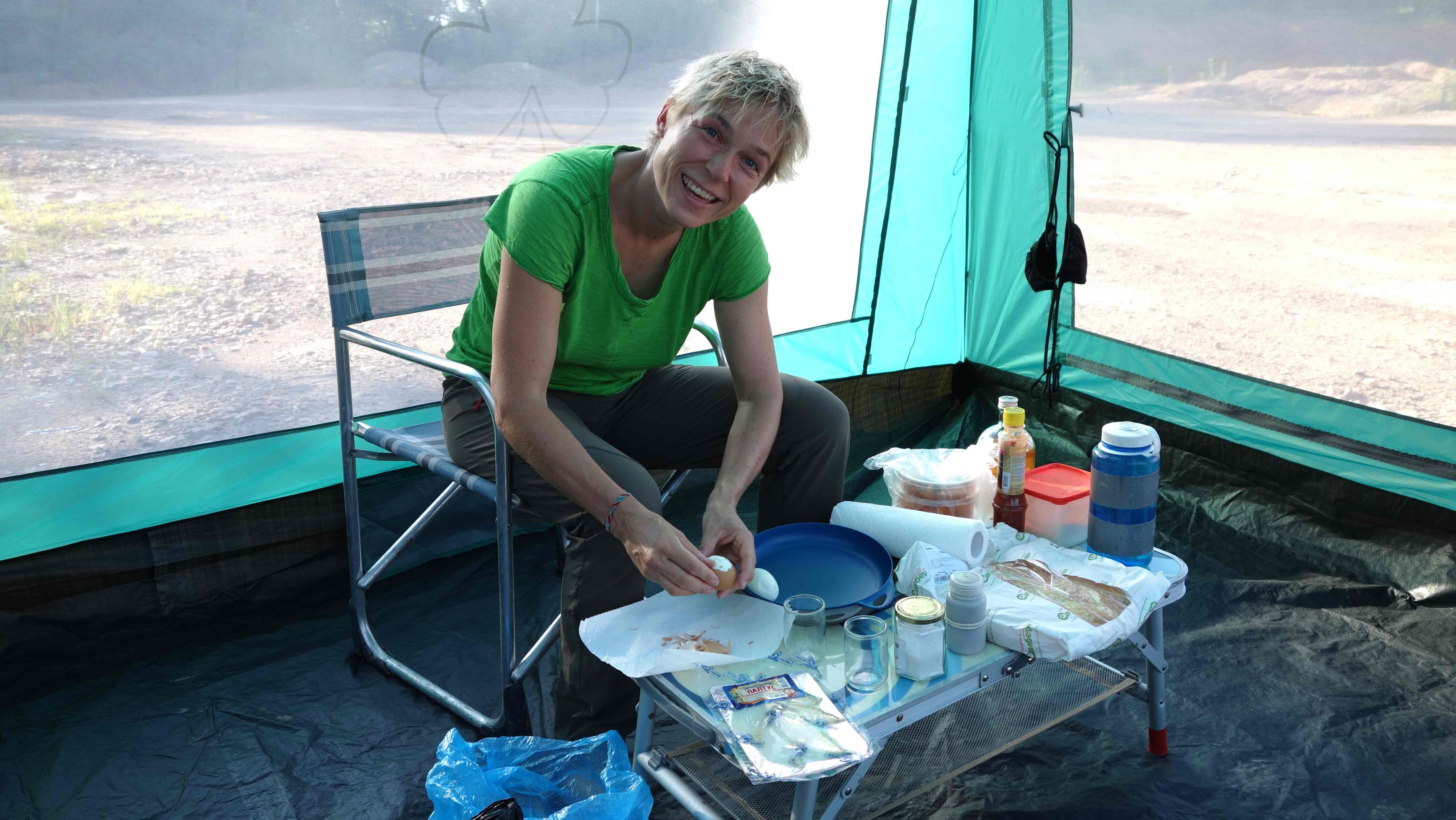 In Khabarovsk we bought a 3x3x2 meter mosquito proof tent! Look at how much Malene is enjoying our first dinner inside the new tent! Now we can cook, we can make exercises, we can even take a small bath inside the tent without struggling with the bloody mosquitos!