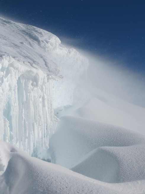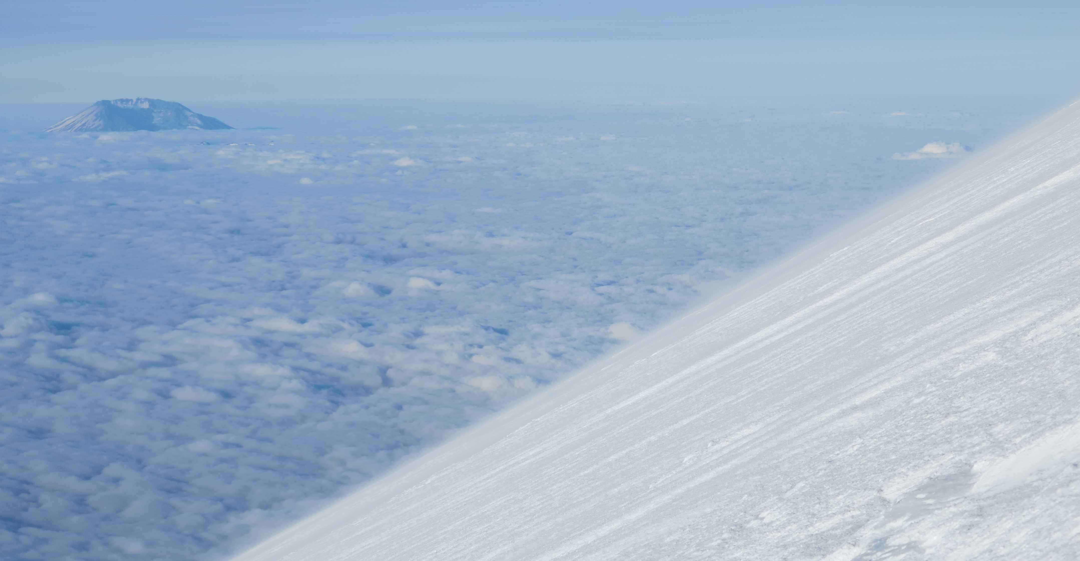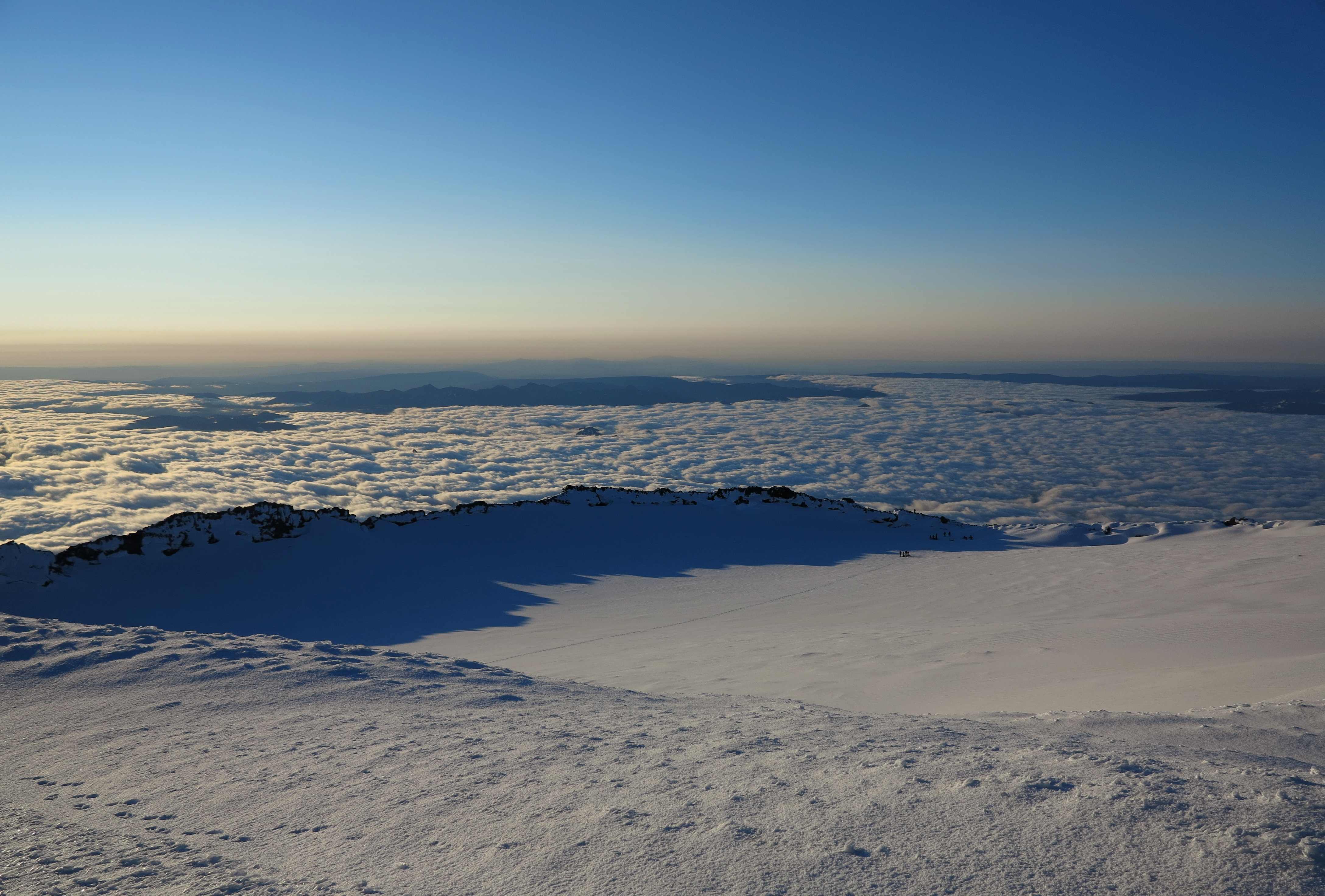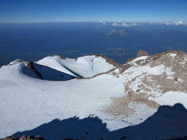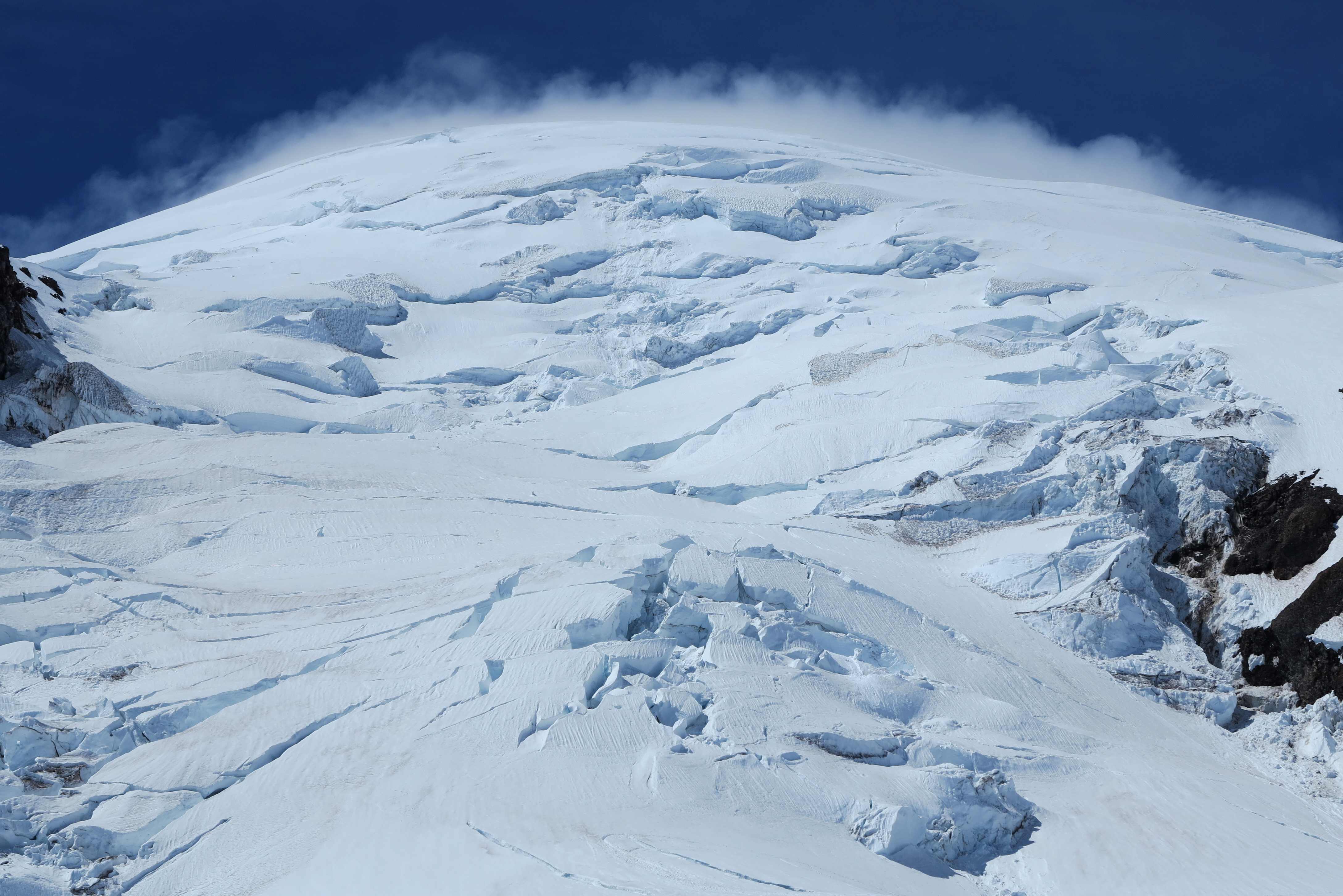 View from Columbia Crest, summit of Mount Rainier, with the ice filled crater in the center.