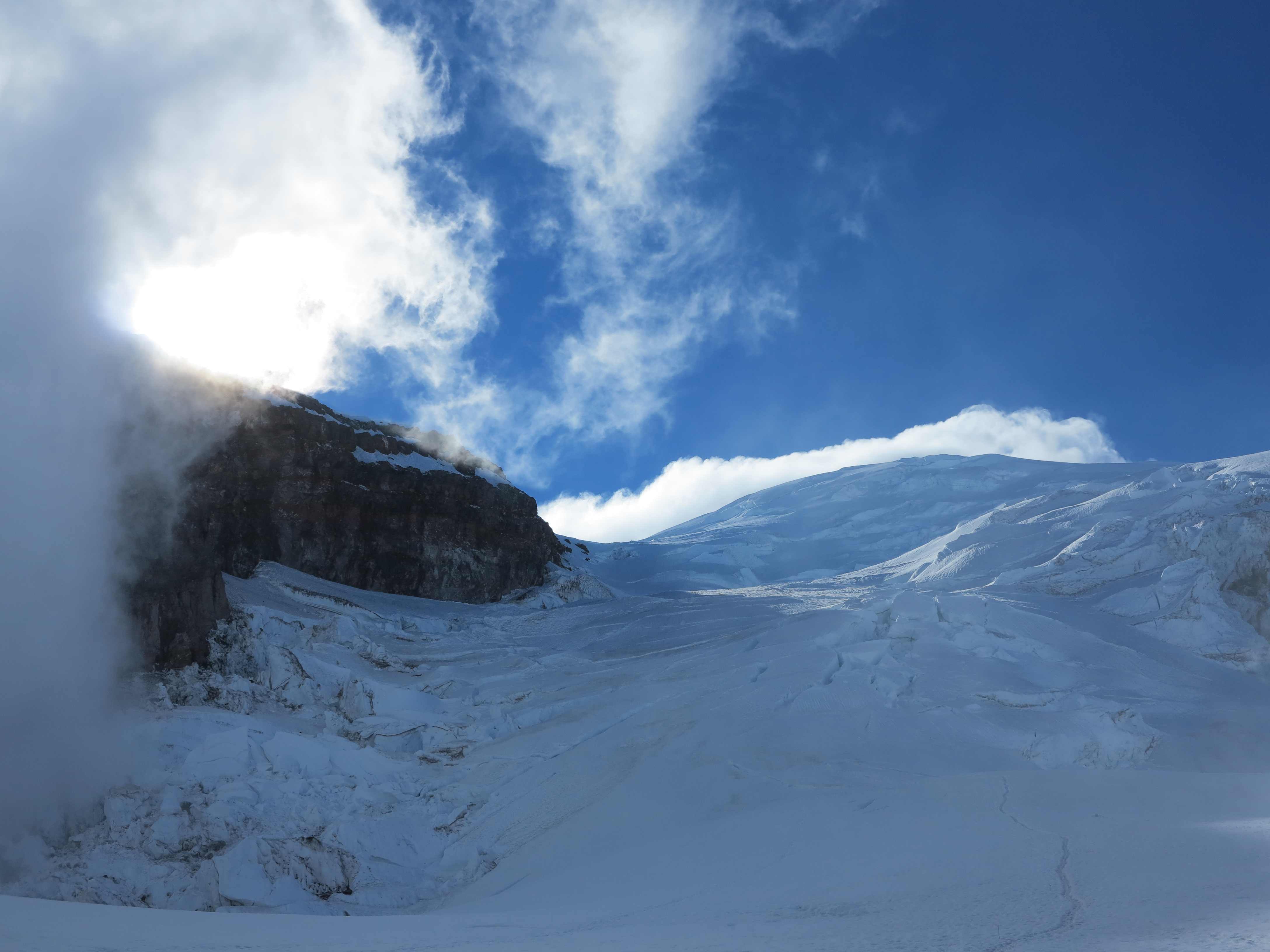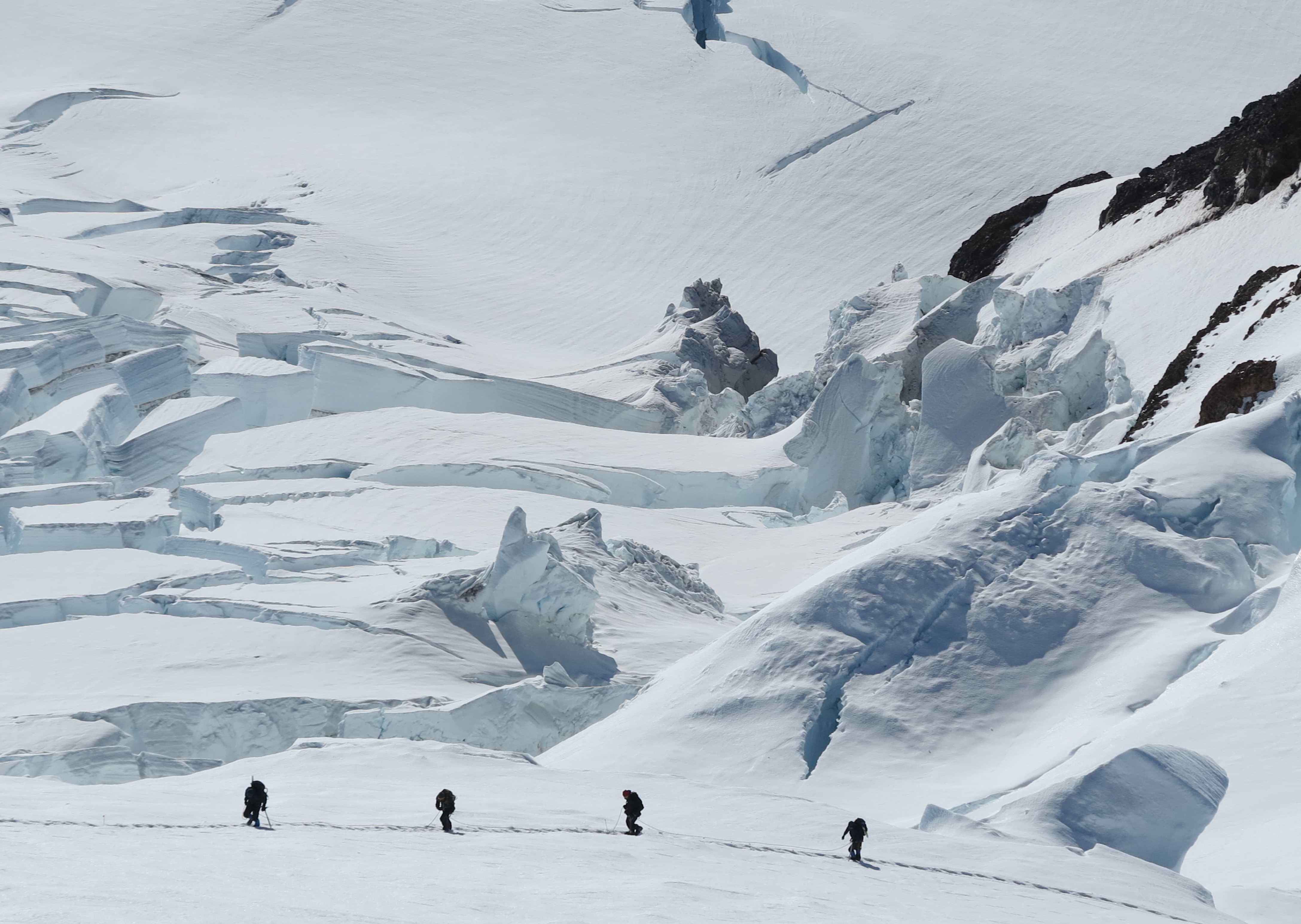 Emmons Glacier as dramatic backdrop to the ascent of four climbers on Mount Rainier