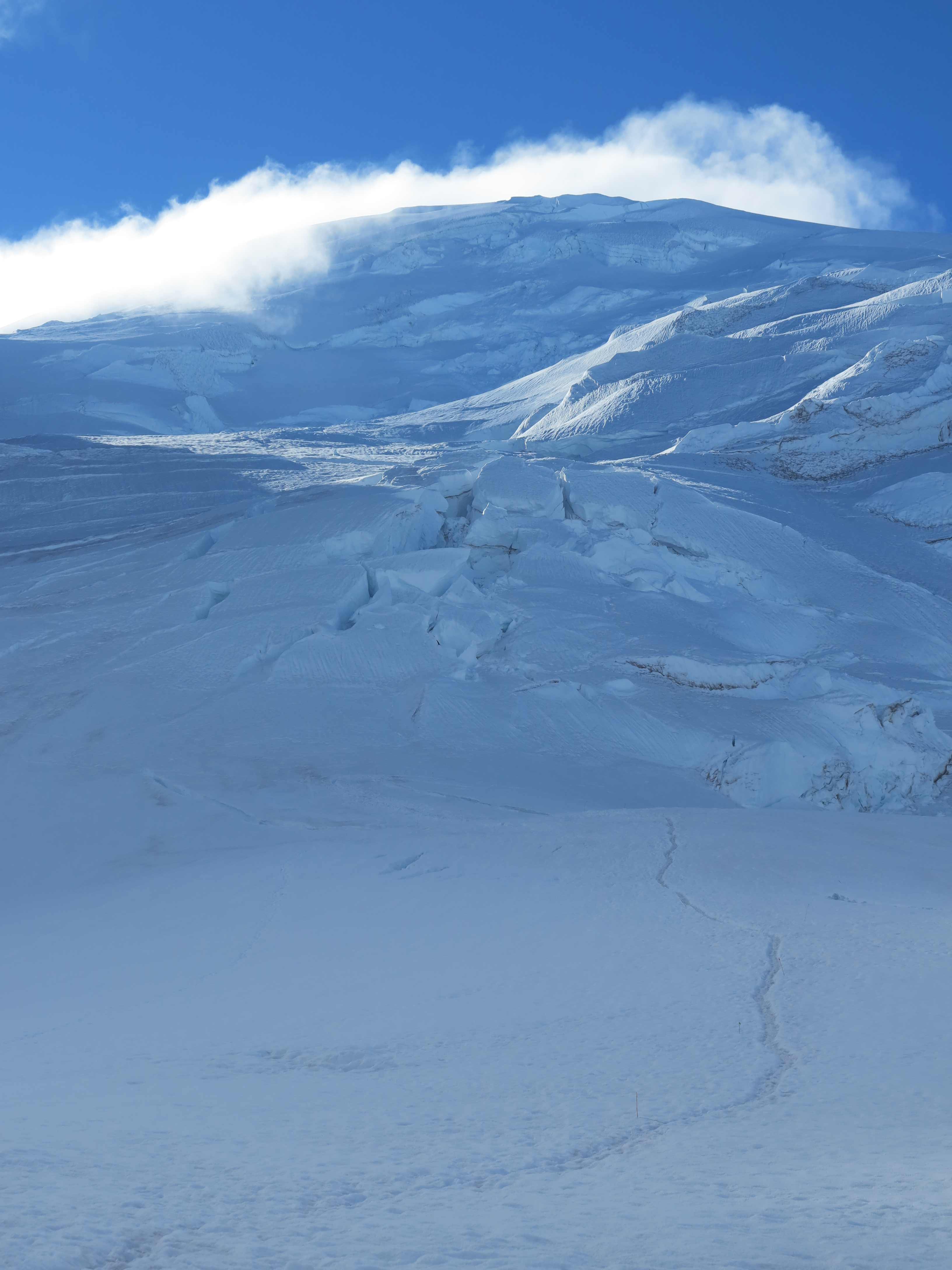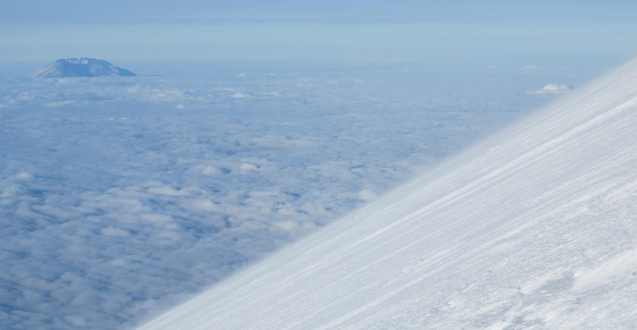 Approaching Ingraham Flats basecamp at approximately 3400 m. To the right, the normal route follows the rocky ridge called Disappointment Cleaver and then continues on the ice and snow covered slope to the summit.