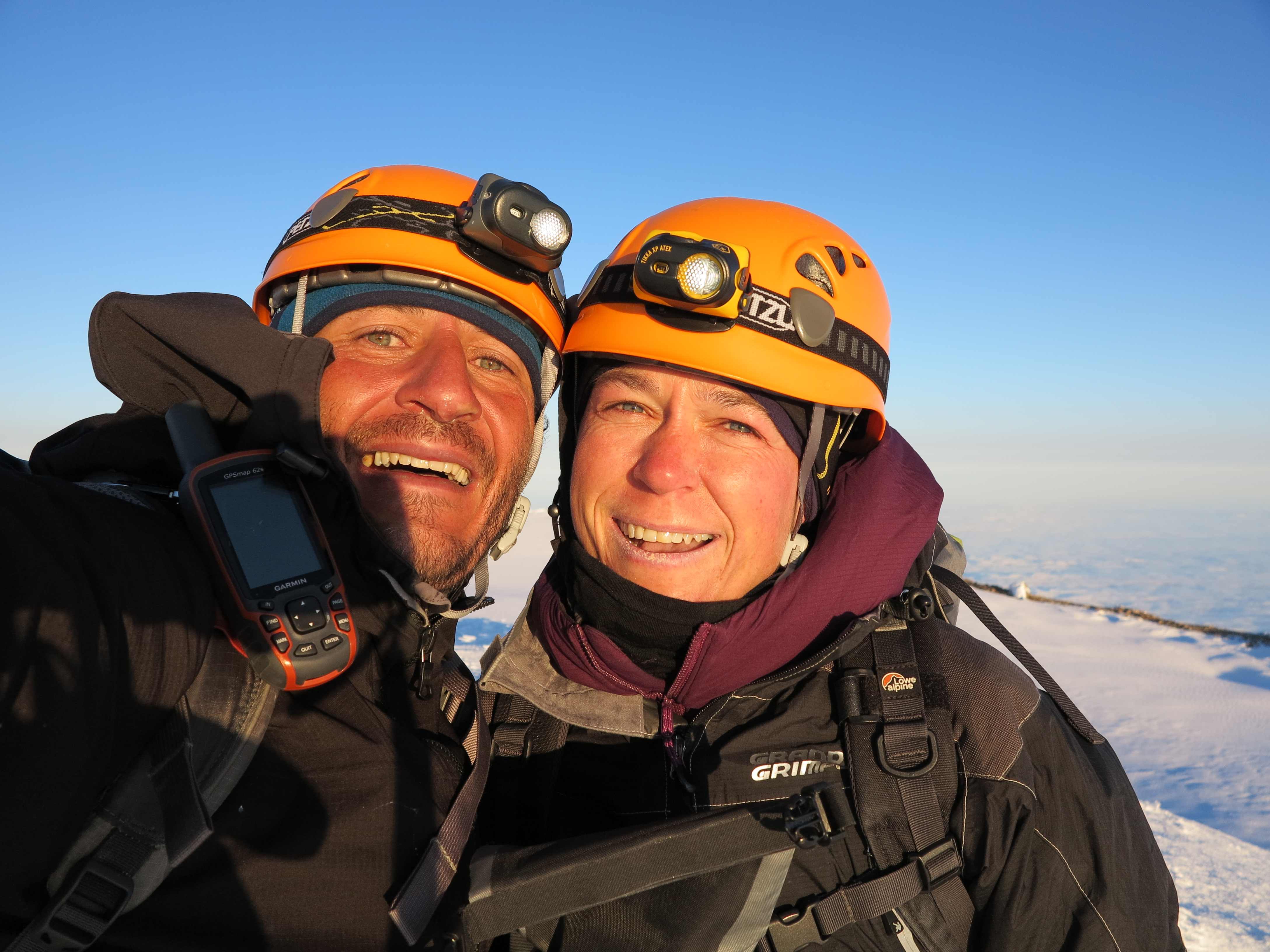 At the summit!!! We took no pictures during the ascent, it was simply too freezing cold! At the time of the photo, the sun has just risen above a slight haze in the horizon and has started gaining power, warming our ice cold, red noses!