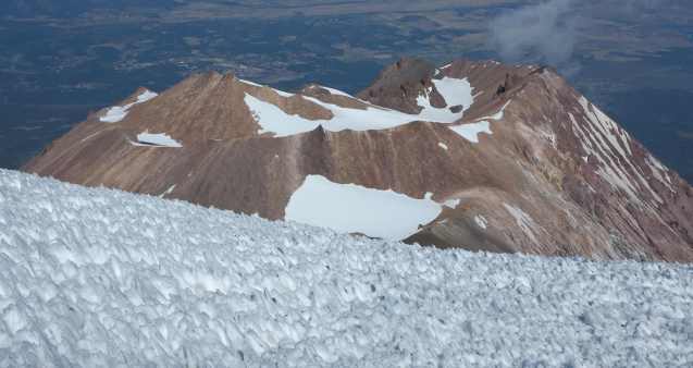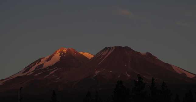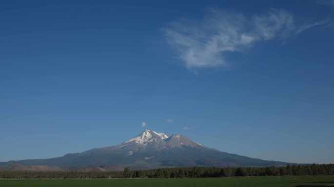 Mt Shasta is a great stratovolcano in California, 4322 m high, the second highest peak in the Cascade Range after Mt Rainier. It seems enormous as it rises over the surrounding forests and farmland.