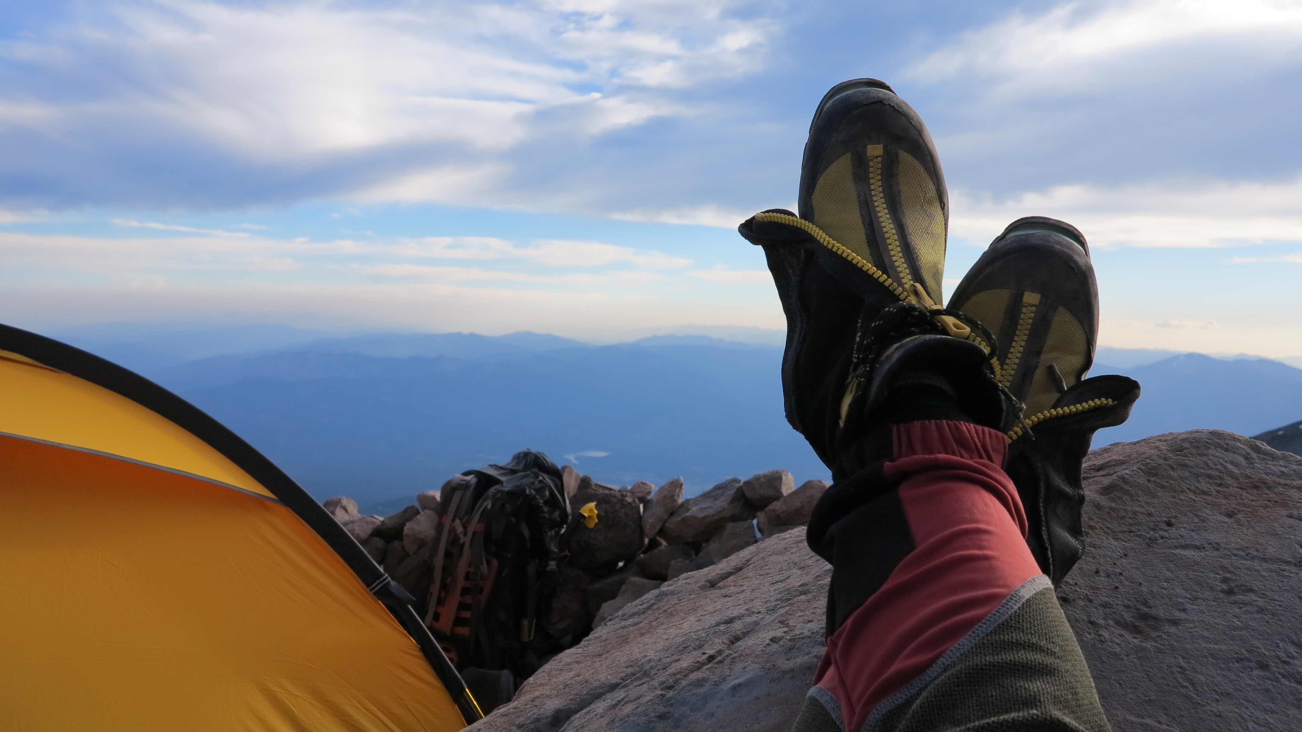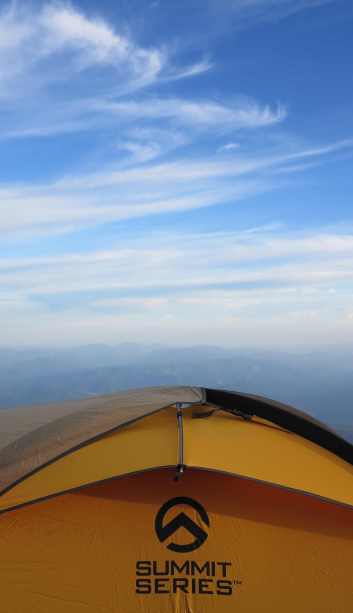 Our tent at Ingraham Flats with a dramatic background of clouds quickly coming and going, in turn obscuring and revealing the mighty peak of Mount Rainier.