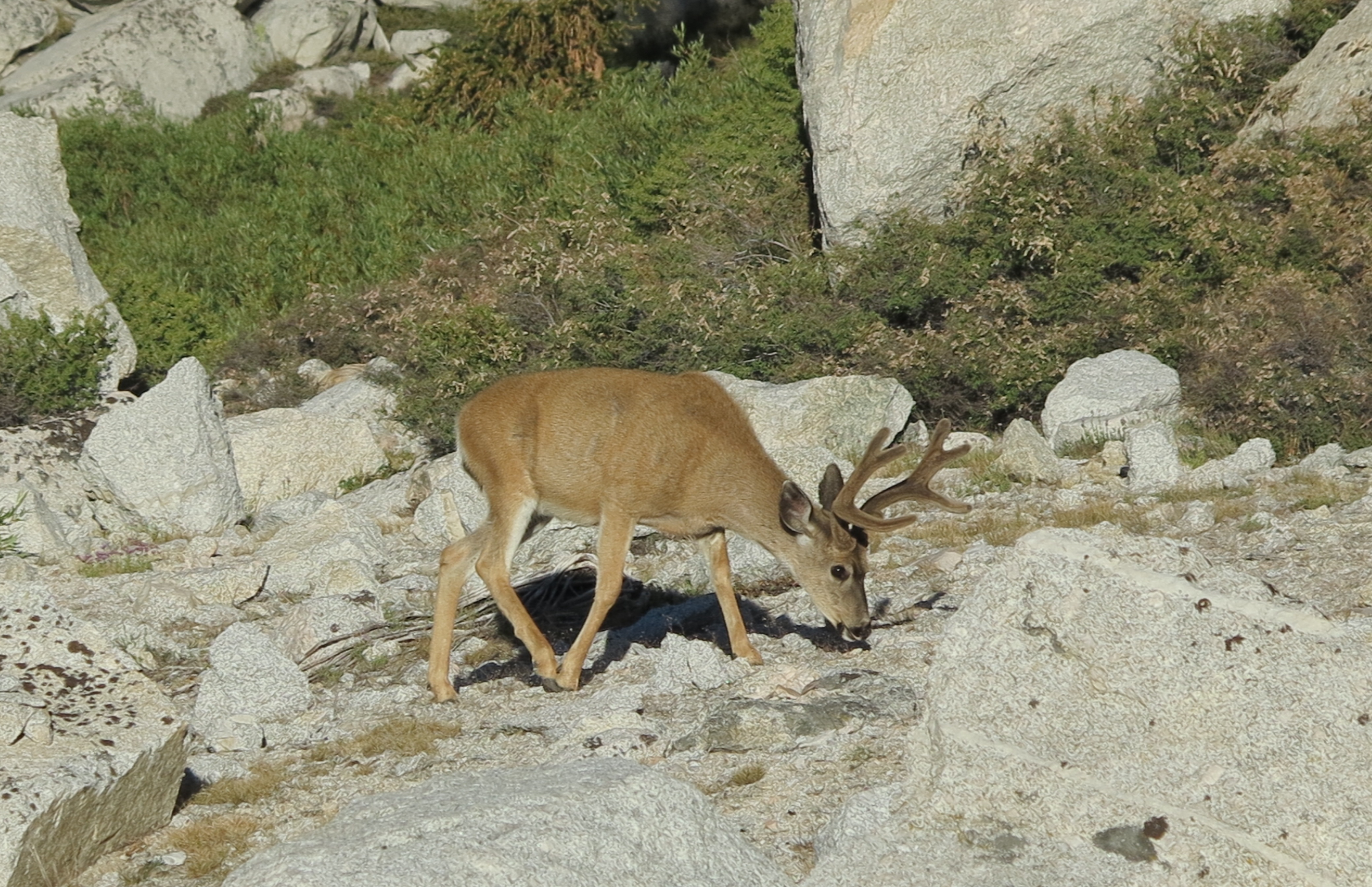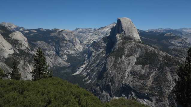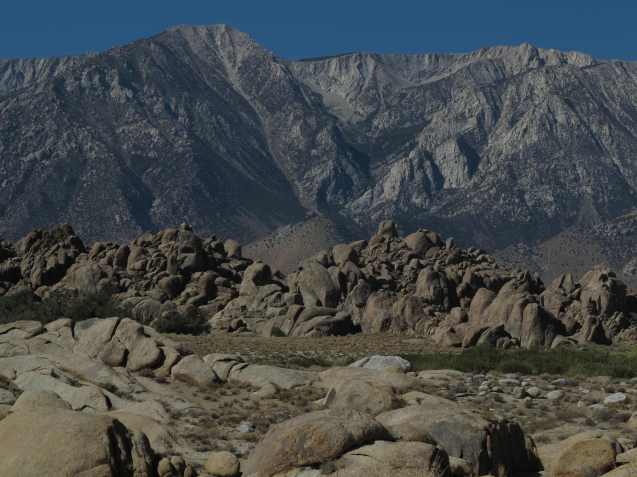 Mount Whitney, a pale granite peak of 4421 m in the Sierra mountains of California (Mt Whitney is the far bright peak in the right hand side of the photo).