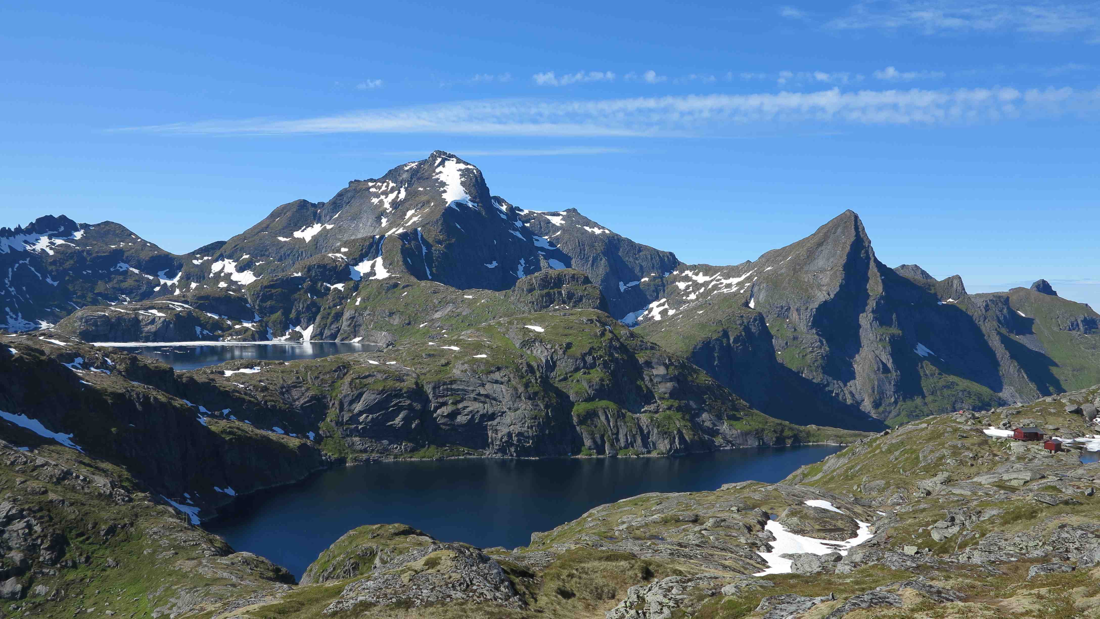 Here it is Hermannsdalstinden with the small red Munkebu hut to the far right.