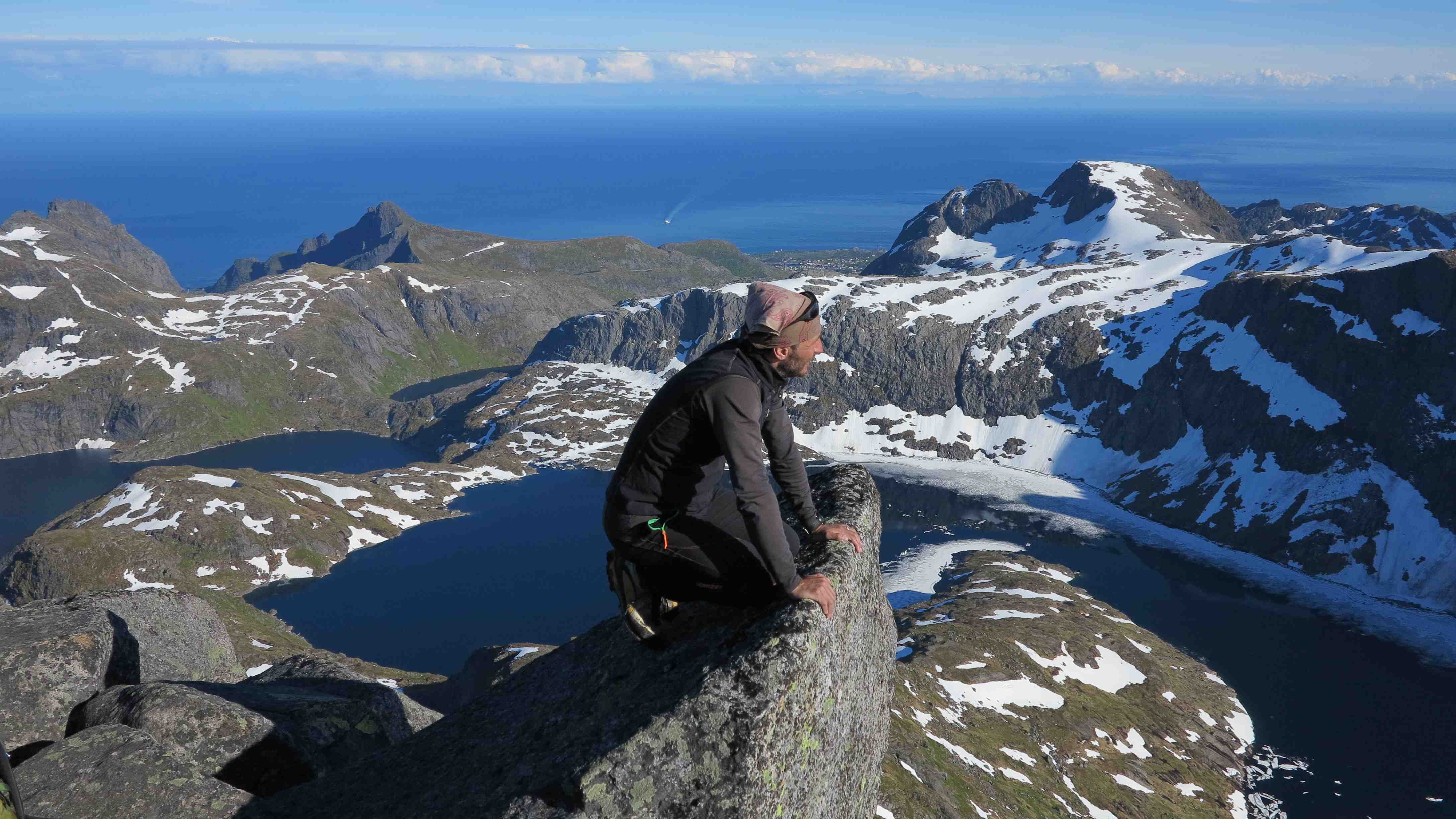 We took off with the tent and sleeping bags to climb the highest mountain in West Lofotoen, the Hermannsdalstinden at 1029 m. It was an unusually beautiful day when we hiked up.