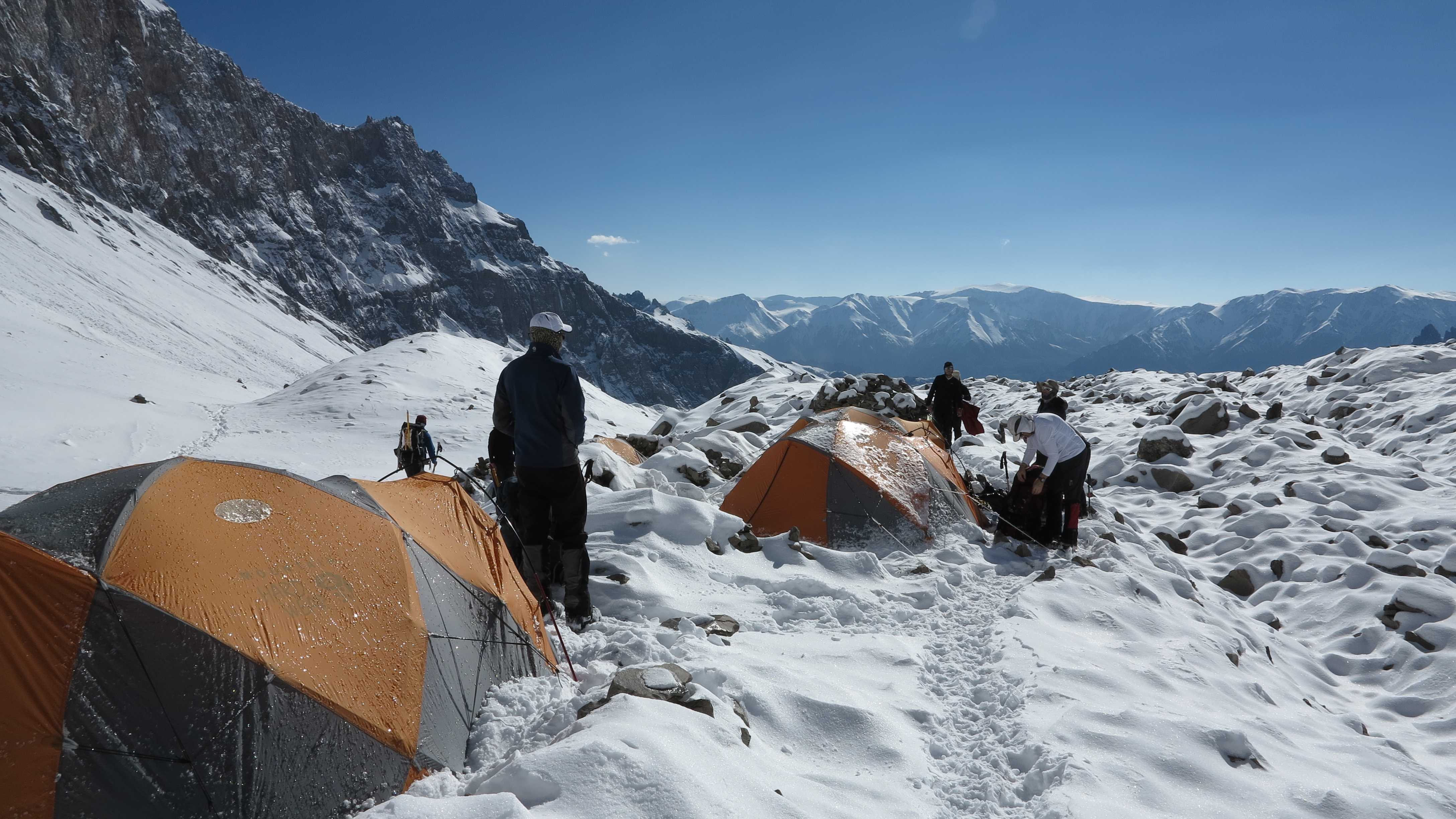By now a lot of snow had fallen on Aconcagua in just a few days and our guides had to make an important decision. Our planned route, the Polish Variation Route, goes up close to the foot of the Polish Glacier where it traverses across the mountain to a high camp at Black Rocks at almost 6300 m. With all the new snow however, this route was becoming too risky with danger of avalanches so Matthew, Danny and Lhakpa decided to change the route and take the lower traverse across to Camp Guanacos at 5500 m and then establish high camp at Camp Colera at 6000 m. This would make our summit day longer but it was the safer option.