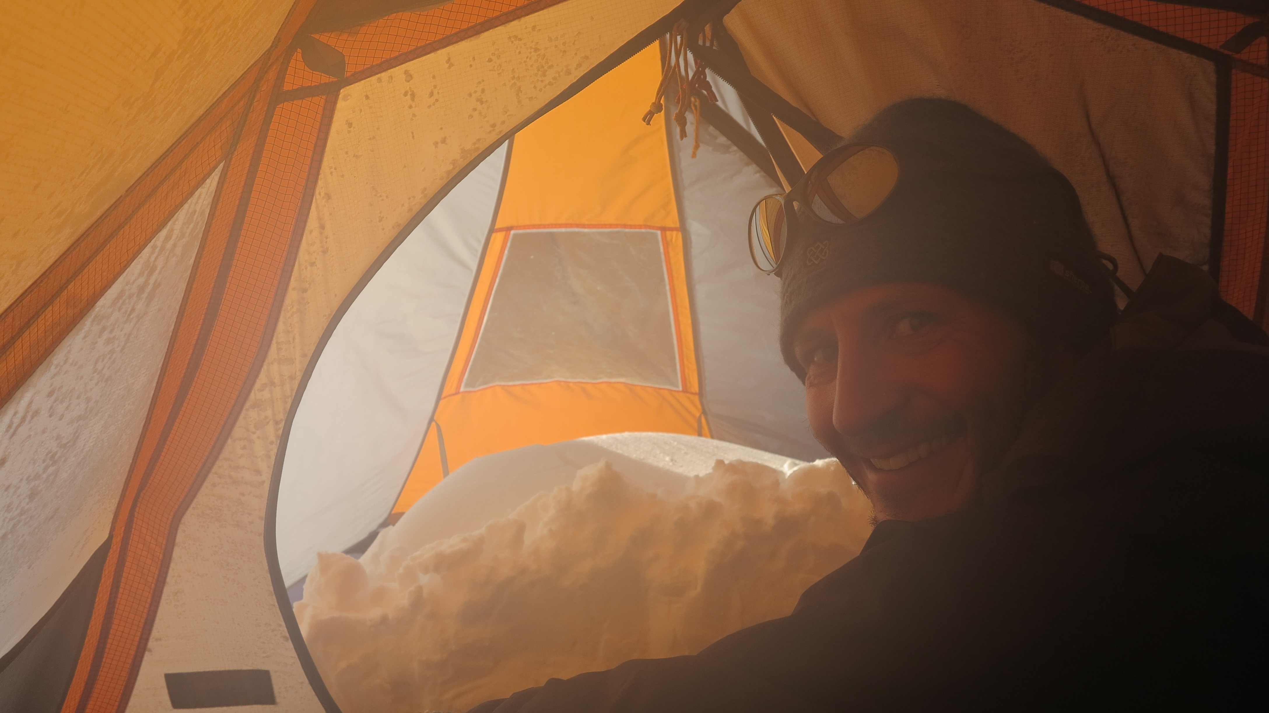 On the morning of 29 January we woke up at 4 am and started preparing ourselves for a summit attempt. “Waking up” is maybe an exaggeration. Nobody got much sleep that night. We were at 6000 m, the air was thin and we were all struggling with breathing at night. Apart from that, the wind had picked up during the night and now it was seriously windy with gusts up to 100 km/hour. We were having trouble hearing what Matthew was shouting in the neighboring tent. Were we going or not? Yes, we are going! Dammit, it was bloody cold even inside the tent, the inner walls were completely covered in ice, which showered down on us every time the wind shook the tent, but we got ourselves ready and Marco went to the guide’s tent to pick up hot water for tea. He came back with the message that the wind was a bit too strong to make it the ideal summit day. Stand by and be ready to leave with short notice if the wind drops! We waited in the sleeping bags with all our clothes on until 7.30. By then it was definitely too late to go and we dozed off until the sun came out and warmed up the frozen world a bit.